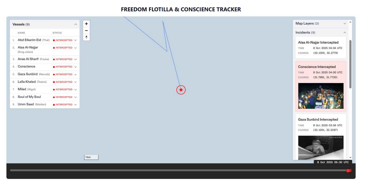 এক্সে দেওয়া এক পোস্টে ইসরায়েলের পররাষ্ট্র মন্ত্রণালয়ও ফ্লোটিলায় অভিযান চালানোর কথা নিশ্চিত করেছে।পোস্টে দাবি করা হয়, আইনগত নৌ-অবরোধ লঙ্ঘনের ও যুদ্ধক্ষেত্রে প্রবেশের আরেকটি প্রচেষ্টা ব্যর্থ হয়েছে।এতে আরও বলা হয়, ‘জাহাজ ও যাত্রীদের ইসরায়েলি বন্দরে পাঠানো হচ্ছে। সব যাত্রী নিরাপদ ও সুস্থ আছেন। আশা করা হচ্ছে, যাত্রীদের দ্রুত নির্বাসিত করা হবে।’এদিকে, ফ্রিডম ফ্লোটিলার ওয়েবসাইটে থাকা ফ্রিডম ফ্লোটিলা ও কনশাসন ট্র্যাকারে বহরে থাকা ৯টি জাহাজই আটক করা হয়েছে বলে দেখা গেছে।এই বহরের অংশ হিসেবে গাজা অভিমুখে থাকা কনশানস নৌযানে ছিলেন দৃকের ব্যবস্থাপনা পরিচালক ও বাংলাদেশি আলোকচিত্রী শহিদুল আলম।
