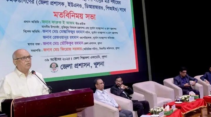 গতকাল বৃহস্পতিবার (৯ অক্টোবর) রাতে খুলনা জেলা শিল্পকলা অ্যাকাডেমি অডিটোরিয়ামে বিভাগের আওতাধীন দুর্যোগ ব্যবস্থাপনা সংশ্লিষ্ট মাঠ পর্যায়ের কর্মকর্তাগণের সঙ্গে মতবিনিময় সভায় তিনি এসব কথা বলেন।