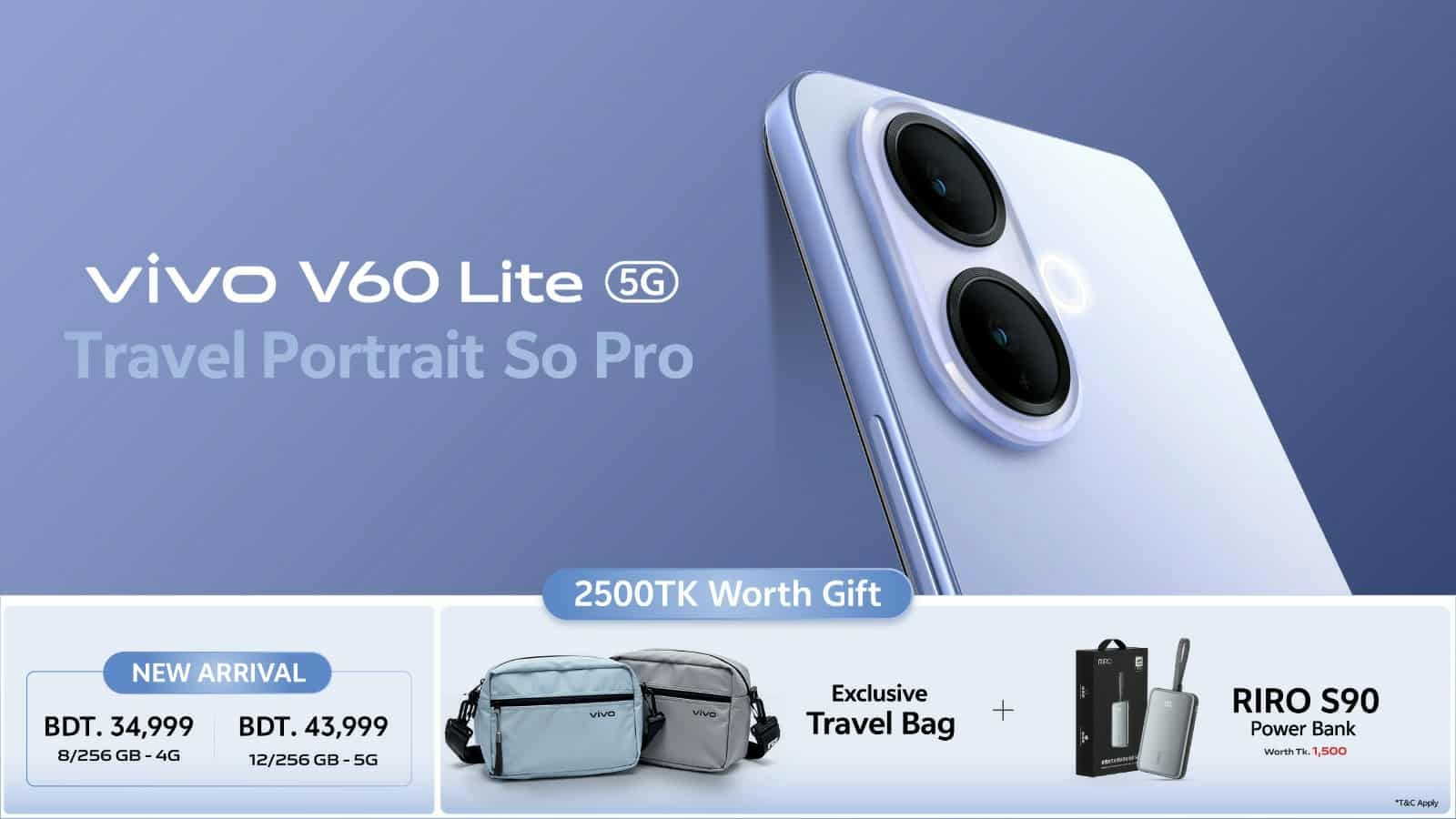 আকর্ষণীয় অফারের সাথে বাজারে এসেছে ভিভো ভি৬০ লাইট। ফাইভজি এবং ফোরজি দুটি সংস্করণে ফোনের দাম যথাক্রমে ৪৩,৯৯৯ টাকা ও ৩৪,৯৯৯ টাকা। ক্রেতারা পাচ্ছেন ২৫০০ টাকার বিশেষ গিফট প্যাক জেতার সুযোগ, যাতে রয়েছে স্টাইলিশ ট্রাভেল ব্যাগ এবং রিরো এস৯০ পাওয়ার ব্যাংক।