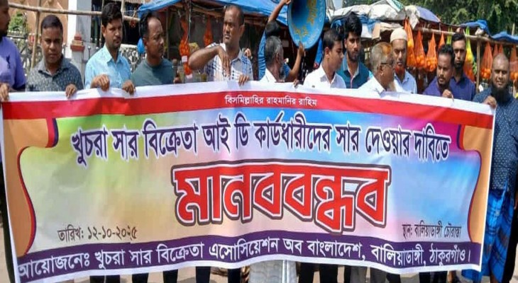 ঠাকুরগাঁওয়ের বালিয়াডাঙ্গীতে খুচরা সার বিক্রেতা আইডি কার্ডধারীদের সার দেওয়ার দাবিতে মানববন্ধন