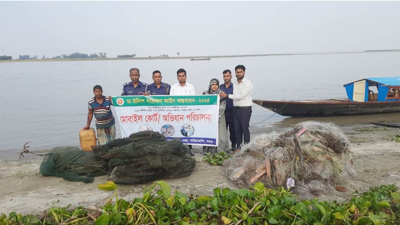 মা ইলিশ সংরক্ষণে সারিয়াকান্দির যমুনা নদীতে অভিযানে, ১০ হাজার মিটার জাল জব্দ