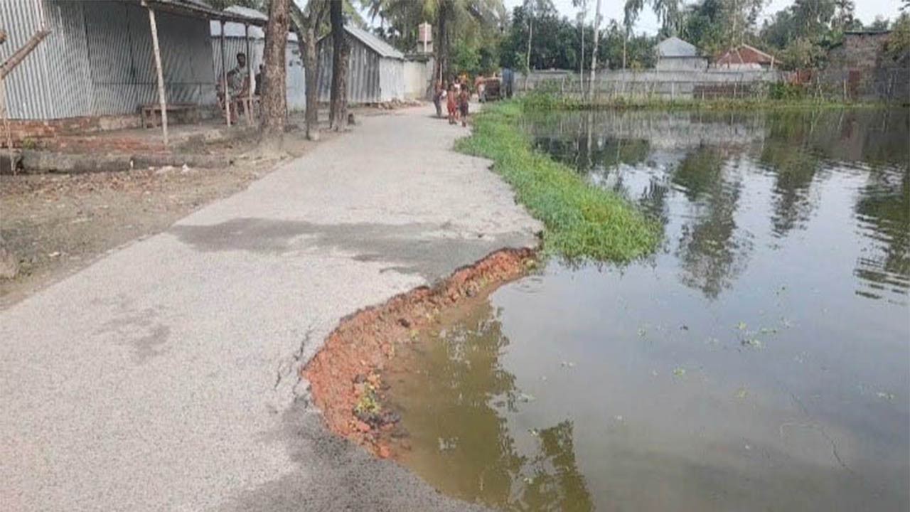 পাবনার সুজানগরে পুকুর গ্রাস করছে গ্রামীণ সড়ক