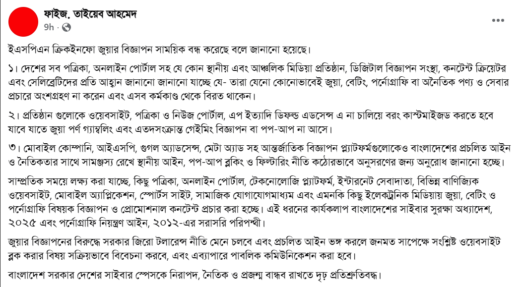 তিনি লেখেন– দেশের সব পত্রিকা, অনলাইন নিউজ পোর্টাল, ডিজিটাল বিজ্ঞাপন সংস্থা, কনটেন্ট ক্রিয়েটর ও সেলিব্রেটিদের প্রতি আহ্বান জানানো হয়েছে যেন তারা কোনোভাবেই জুয়া, বেটিং, পর্নোগ্রাফি বা অনৈতিক পণ্য ও সেবার প্রচারে অংশগ্রহণ না করেন এবং এসব কর্মকাণ্ড থেকে বিরত থাকেন।