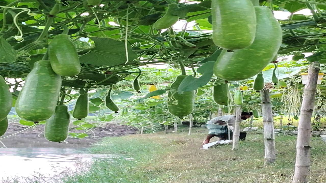 দিনাজপুরের কাহারোলে পুকুরপাড়ে লাউ চাষ