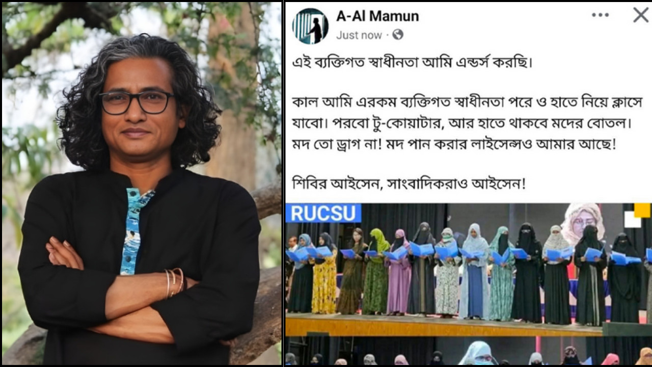 অধ্যাপক মামুন তার ফেসবুকে রাকসু হল সংসদের নারীদের শপথ গ্রহণের ছবি দিয়ে লেখেন ‘এই ব্যক্তিগত স্বাধীনতা আমি এন্ডর্স করছি। কাল আমি এরকম ব্যক্তিগত স্বাধীনতা পরে ও হাতে নিয়ে ক্লাসে যাবো। পরবো টু-কোয়াটার, আর হাতে থাকবে মদের বোতল। মদ তো ড্রাগ না! মদ পান করার লাইসেন্সও আমার আছে! শিবির আইসেন, সাংবাদিকরাও আইসেন!’