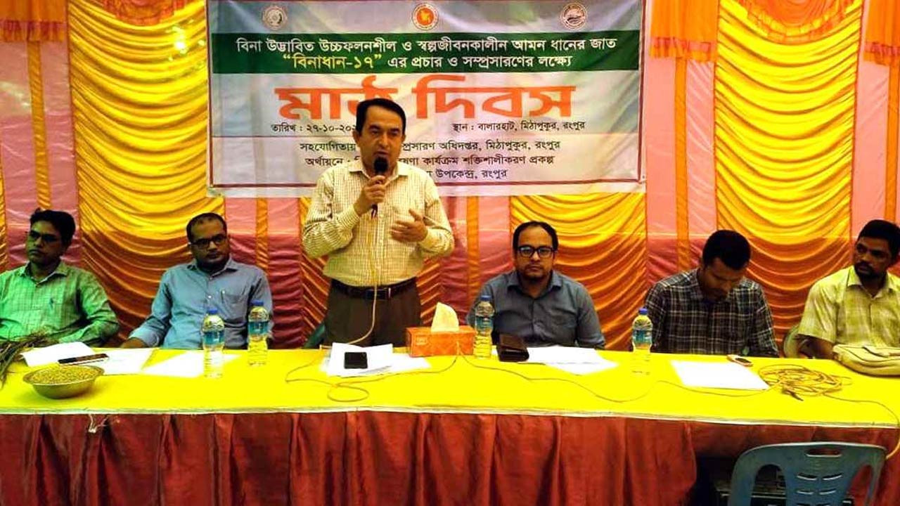 আরও পড়ুনবাংলাদেশ পরমানু কৃষি গবেষণা ইন্সটিটিউট (বিনা) উপকেন্দ্র রংপুরের আয়োজনে অনুষ্ঠিত মাঠ দিবসে প্রধান অতিথির বক্তব্য রাখেন, রংপুর অঞ্চলের আঞ্চলিক বীজ প্রত্যয়ন অফিসার ড. পলাশ সরকার।
