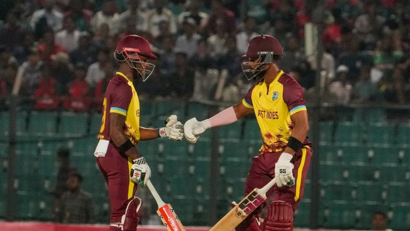 ওপেনিংয়ে শুরুটা ভালোই করেছিল ক্যারিবীয়রা। তবে ব্র্যান্ডন কিং ১ রানে তাসকিন আহমেদের বলে ক্যাচ তুলে ফিরলে ভাঙে প্রথম জুটি। এরপর ইনিংস সামলান দুই তরুণ ব্যাটার অ্যালিক আথানাজ ও শাই হোপ। তারা দুজনই খেলেন দারুণ দুটি ইনিংস—আথানাজ ৩৩ বলে ৫২ ও হোপ ৩৬ বলে ৫৫ রান করেন।