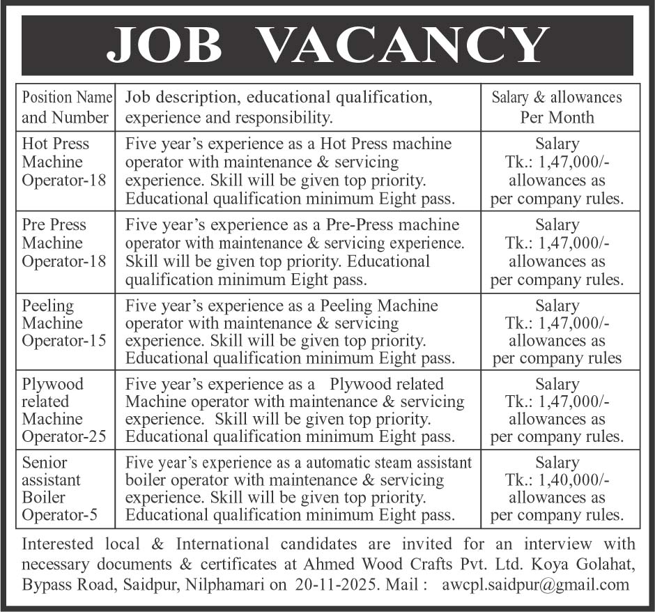 Interested local & International candidates are invited for an interview with necessary documents & certificates at Ahmed Wood Crafts Pvt. Ltd. Koya Golahat, Bypass Road, Saidpur, Nilphamari on 20-11-2025. Mail: awcpl.saidpur@gmail.com