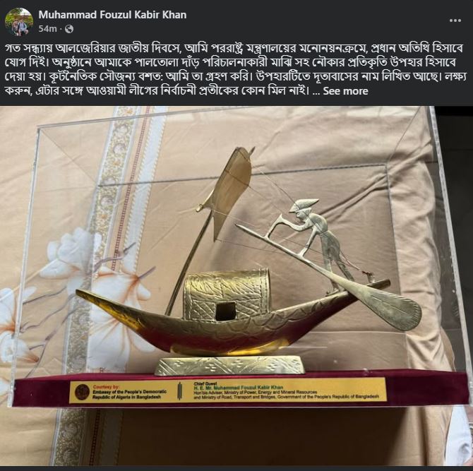 যদিও পরদিন রোববার এক ফেসবুক পোস্টে বিষয়টি খোলাসা করেছেন উপদেষ্টা নিজেই। একই সঙ্গে এ উপহার নিয়ে কী করবেন, তা জানতে চেয়েছেন।তিনি লিখেছেন, গত সন্ধ্যায় আলজেরিয়ার জাতীয় দিবসে, আমি পররাষ্ট্র মন্ত্রণালয়ের মনোনয়নক্রমে, প্রধান অতিথি হিসেবে যোগ দিই। অনুষ্ঠানে আমাকে পালতোলা দাঁড় পরিচালনাকারী মাঝিসহ নৌকার প্রতিকৃতি উপহার হিসেবে দেওয়া হয়। কূটনৈতিক সৌজন্য বশত: আমি তা গ্রহণ করি। উপহারটিতে দূতাবাসের নাম লিখিত আছে। লক্ষ্য করুন, এটার সঙ্গে আওয়ামী লীগের নির্বাচনী প্রতীকের কোন মিল নাই।পরামর্শ চেয়ে তিনি আরও লেখেন, এখন আমি এটি আলজেরিয় দূতাবাসে ফেরত পাঠাতে পারি। এটা অসৌজন্যমূলক ও হীনমন্যতা প্রসূত হবে; সরকারি তোশাখানায় জমা দিতে পারি। যদিও এটা খুব মূল্যবান কিছু নয়; শৈলান প্রবীণ নিবাসে রাখতে পারি; অথবা নিজে রেখে দিতে পারি।তিনি শেষে লেখেন, পাঠকের পরামর্শ পেলে উপকৃত হব।