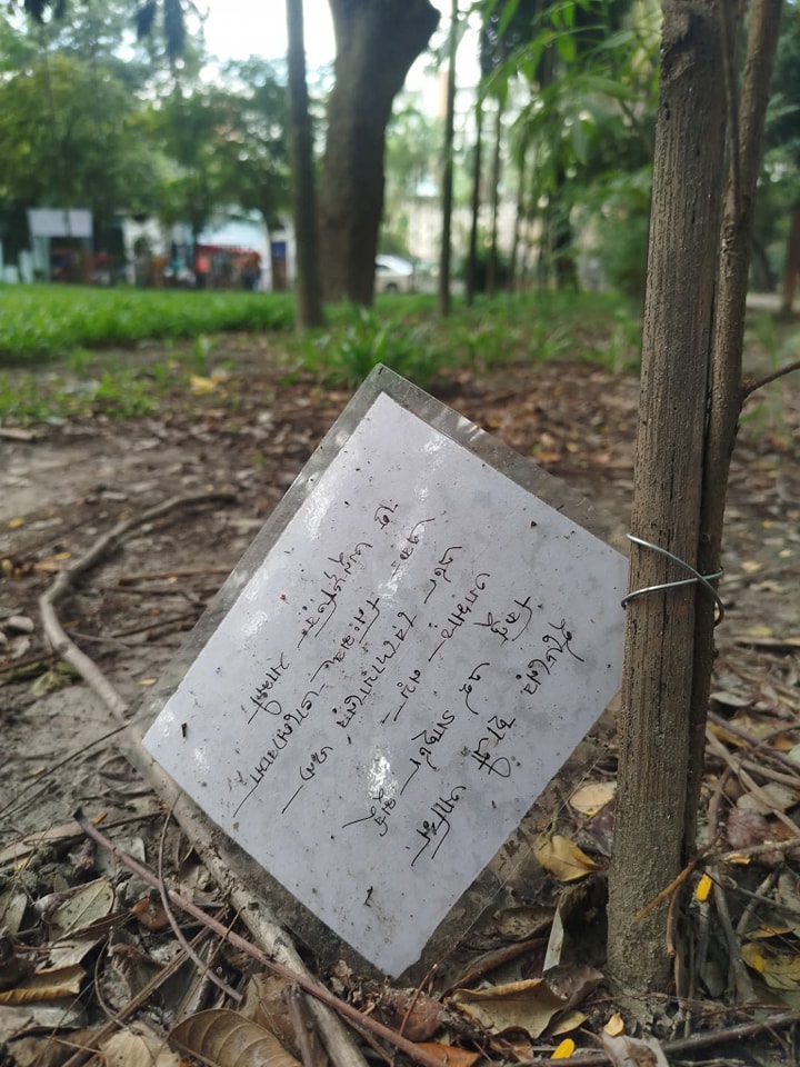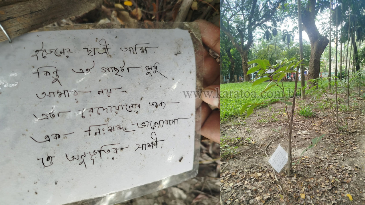 মঙ্গলবার (০৩ নভেম্বর) মলচত্বরে  শিক্ষার্থীরা গাছের সঙ্গে একটি ছোট সাদা কাগজের চিরকুট ঝুলতে দেখেন। তাতে পরিষ্কারভাবে লেখা ছিল—ইডেনের ছাত্রী আমি কিন্তু এই গাছটা শুধু আমার নয়,এটা রেদেয়ানের জন্য এক নিঃশব্দ ভালোবাসা ও অনুভূতির সাক্ষী।