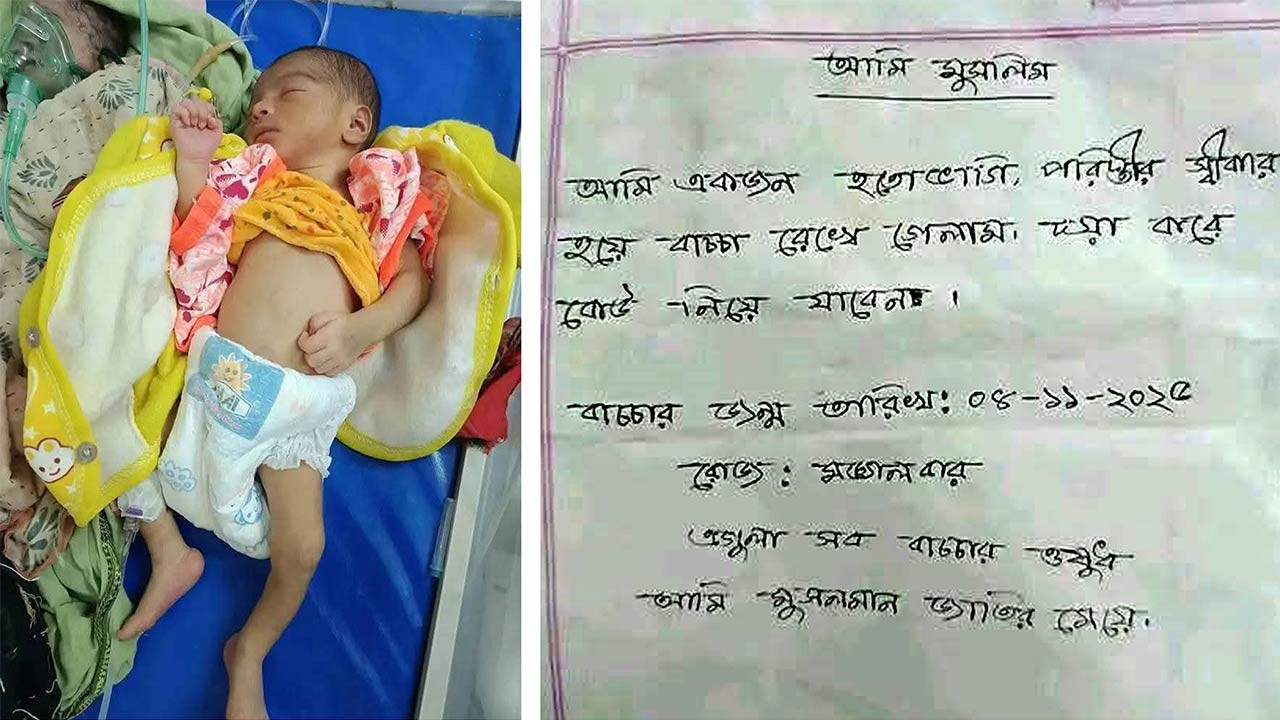 দিনাজপুর জেলা প্রতিনিধি : ‘আমি মুসলিম। আমি একজন হতভাগি, পরিস্থিতির শিকার হয়ে বাচ্চা রেখে গেলাম। দয়া করে কেউ নিয়ে যাবেন। বাচ্চার জন্ম তারিখ-০৪/১১/২০২৫, রোজ-মঙ্গলবার। এগুলো সব বাচ্চার ওষুধ। আমি মুসলমান জাতির মেয়ে।’ -এমন একটি চিরকুট রেখে দিনাজপুর মেডিকেল কলেজ হাসপাতালে একটি নবজাতককে (মেয়ে) রেখে পালিয়ে গেছেন মা।