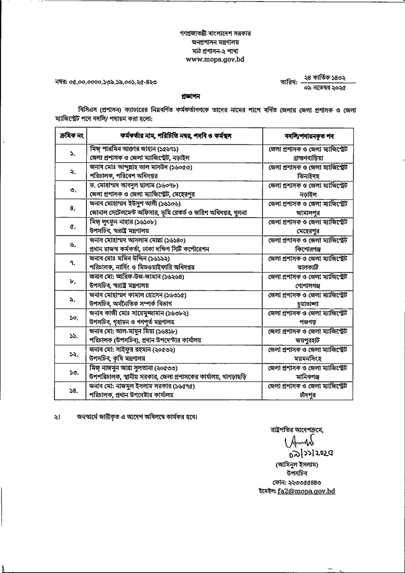 রোববার (৯ নভেম্বর) জনপ্রশাসন মন্ত্রণালয়ের মাঠ প্রশাসন-২ শাখা থেকে এ বিষয়ে প্রজ্ঞাপন জারি করা হয়।