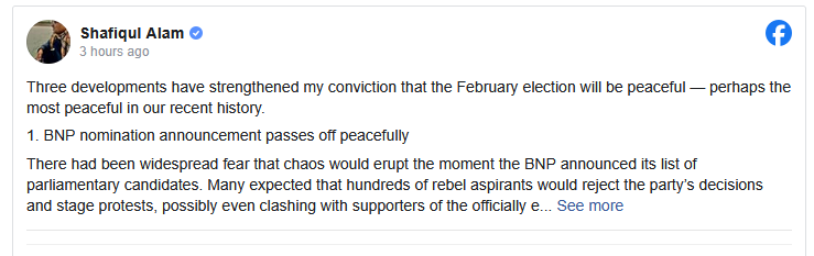 প্রধান উপদেষ্টার প্রেস সচিব শফিকুল আলম মন্তব্য করেছেন ফেব্রুয়ারির নির্বাচন শান্তিপূর্ণ হবে। সম্ভবত সাম্প্রতিক ইতিহাসে সবচেয়ে শান্তিপূর্ণ নির্বাচনও হতে পারে। তিনটি সাম্প্রতিক ঘটনা এমন বিশ্বাসকে আরও দৃঢ় করেছে । তিনি বলেন, আওয়ামী লীগের তৃণমূল ভেঙে গেছে বা প্রতিদ্বন্দ্বী দলগুলোতে মিলিয়ে গেছে। এই পরিস্থিতিতে নির্বাচনে ব্যাঘাত ঘটানোর মতো শক্তি তাদের হাতে অবশিষ্ট নেই। শনিবার (১৫ নভেম্বর) সকালে সামাজিক যোগাযোগমাধ্যম ফেসবুকে নিজের ভেরিফায়েড অ্যাকাউন্টে দেয়া এক স্ট্যাটাসে তিনি এ মন্তব্য করেন।