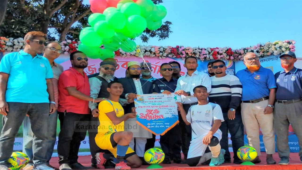 এর আগে বেলুন ও ফেস্টুন উড়িয়ে ফুটবল টুর্নামেন্টের উদ্বোধন ঘোষণা করেন বগুড়ার অতিরিক্ত জেলা ম্যাজিস্ট্রেট (এডিএম) মো: মাসুদ হোসেন। বিশেষ অতিথি ছিলেন অতিরিক্ত পুলিশ সুপার মো: আতোয়ার রহমান।