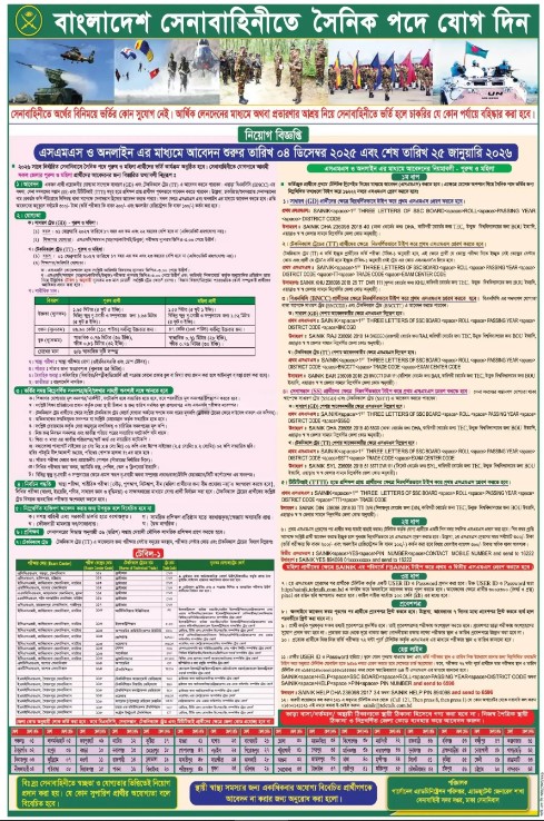 বাংলাদেশ সেনাবাহিনীতে ‘সৈনিক’ পদে জনবল নিয়োগ দেওয়া হবে। আগ্রহী প্রার্থীরা ২০২৬ সালের ২৫ জানুয়ারি পর্যন্ত এসএমএস ও অনলাইনের মাধ্যমে আবেদন করতে পারবেন। একজন প্রার্থী সাধারণ (জিডি) অথবা টেকনিক্যাল ট্রেড (টিটি) বিভাগে আবেদনের সুযোগ পাবেন।