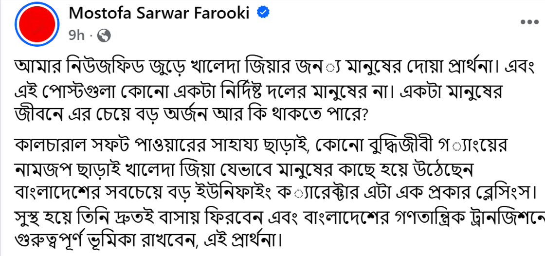 শুক্রবার (২৮ নভেম্বর) রাতে নিজের ভেরিফায়েড ফেসবুক আইডিতে দেওয়া এক পোস্টে তিনি এ প্রার্থনা করেন। ফেসবুক পোস্টে মোস্তফা সরয়ার ফারুকী লেখেন, ‘আমার নিউজফিড জুড়ে খালেদা জিয়ার জন্য মানুষের দোয়া প্রার্থনা। এবং এই পোস্টগুলা কোনো একটা নির্দিষ্ট দলের মানুষের না। একটা মানুষের জীবনে এর চেয়ে বড় অর্জন আর কি থাকতে পারে?’তিনি আরও লেখেন, ‘কালচারাল সফট পাওয়ারের সাহায্য ছাড়াই, কোনো বুদ্ধিজীবী গ্যাংয়ের নামজপ ছাড়াই খালেদা জিয়া যেভাবে মানুষের কাছে হয়ে উঠেছেন বাংলাদেশের সবচেয়ে বড় ইউনিফাইং ক্যারেক্টার, এটা এক প্রকার ব্লেসিংস।সুস্থ হয়ে তিনি দ্রুতই বাসায় ফিরবেন এবং বাংলাদেশের গণতান্ত্রিক ট্রানজিশনে গুরুত্বপূর্ণ ভূমিকা রাখবেন, এই প্রার্থনা।’