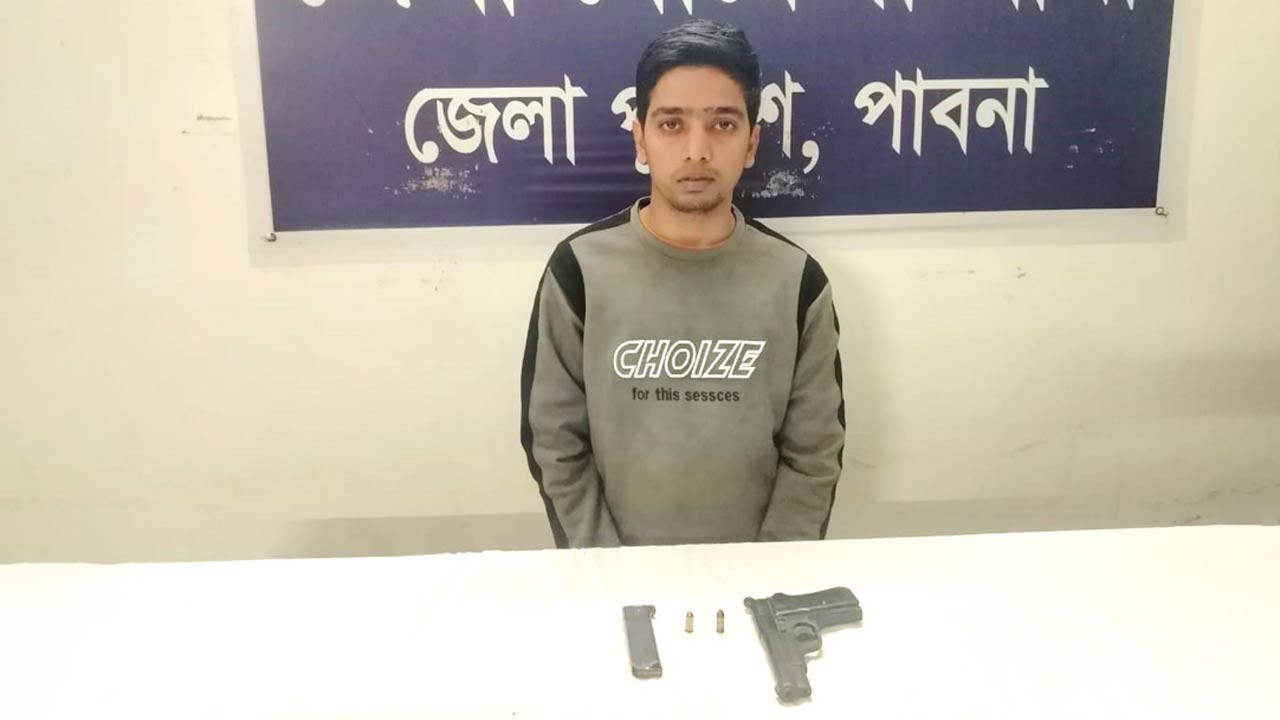 পাবনার ঈশ্বরদীতে অস্ত্র উঁচিয়ে গুলি করা যুবক তুষার গ্রেফতার পিস্তল-গুলি জব্দ