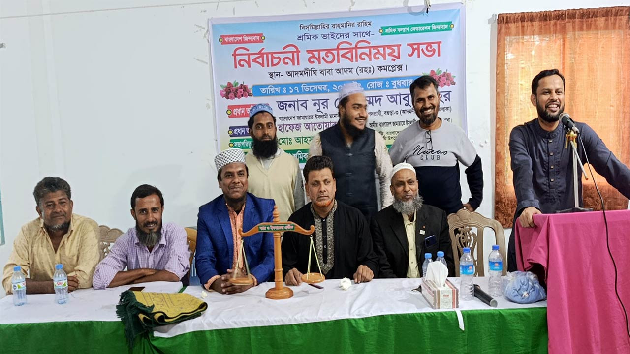 বাংলাদেশ শ্রমিক কল্যাণ ফেডারেশন উপজেলা শাখার সভাপতি আহসান হাবীব পল্টুর সভাপতিত্বে মতবিনিময় সভায় প্রধান অতিথির বক্তব্য রাখেন বগুড়া-৩ (আদমদীঘি-দুপচাঁচিয়া) আসনের এমপি প্রার্থী নূর মোহাম্মদ আবু তাহের। শ্রমিক কল্যাণ ফেডারেশনের সেক্রেটারি ফরিদুল ইসলামের সঞ্চালনায় এতে প্রধান আলোচক ছিলেন, উপজেলা জামায়াতের আমির হাফেজ আতোয়ার হোসেন।
