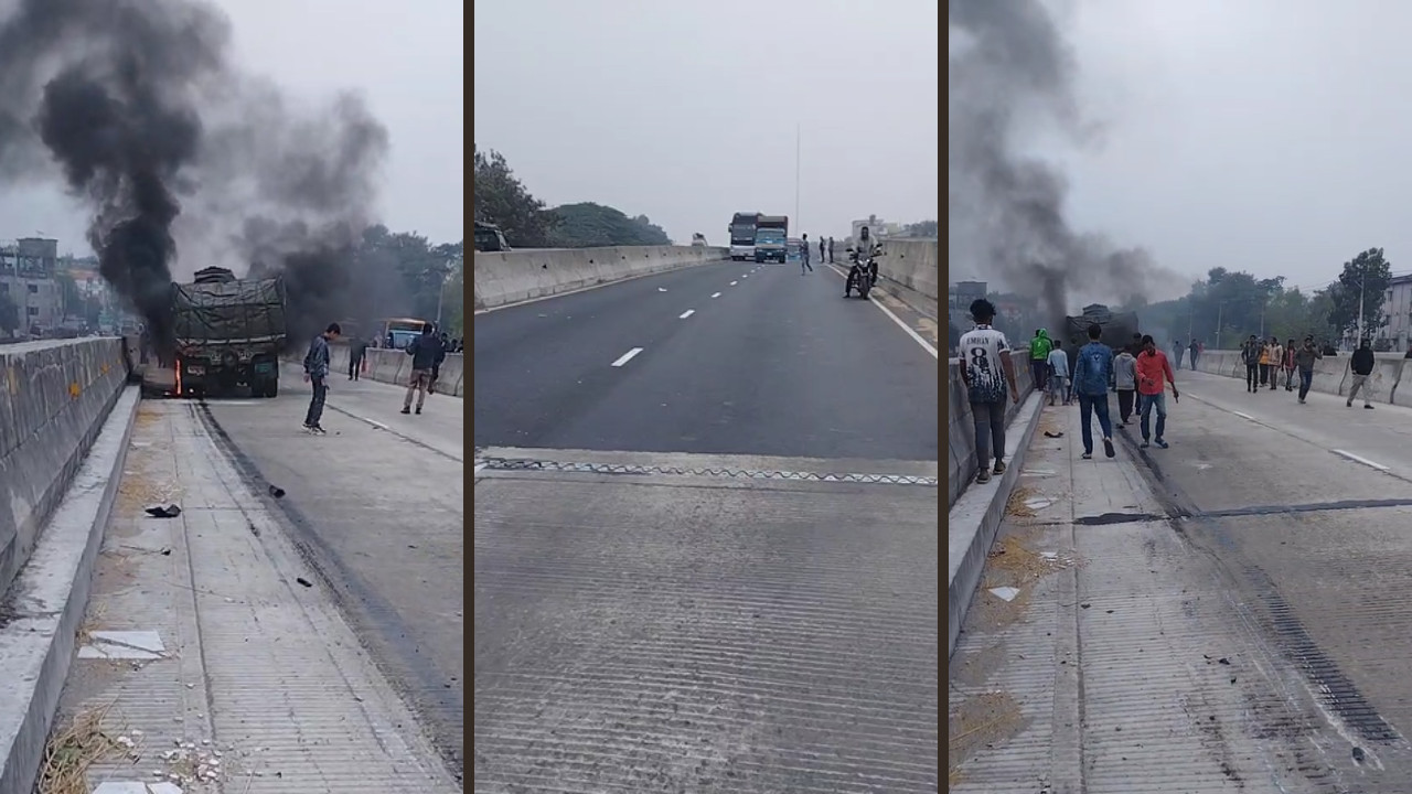 প্রত্যক্ষদর্শীরা জানান, চালবোঝাই একটি ট্রাক (ঢাকা মেট্রো ট ২২-৭৯৩৭) ঢাকার দিকে যাচ্ছিল। দুপুর সোয়া ১টার দিকে ড্যান্সিং প্যাটার্নে মোটরসাইকেল চালিয়ে একই দিকে যাচ্ছিলেন দুই যুবক। বি-ব্লক এলাকায় পৌঁছামাত্র মোটরসাইকেলটি ট্রাকের পিছনের চাকার নিচে ঢুকে পড়ে। সাথে সাথে মোটরসাইকেলে আগুন ধরে যায়। আগুনে ট্রাকের চাকা বিকট শব্দে ফেটে যায়। এতে ঘটনাস্থলেই মোটরসাইকেল আরোহী এক যুবকের মৃত্যু হয়। অপর একজন গুরুতর আহত হন।