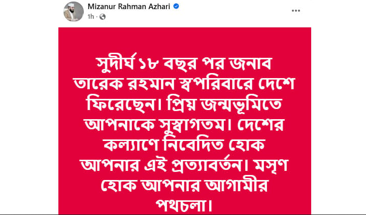 স্বাগত জানিয়েছেন দেশের জনপ্রিয় ইসলামী আলোচক মাওলানা মিজানুর রহমান আজহারী। নিজের ভেরিফায়েড ফেসবুক পেজে তিনি লিখেনে, ‘সুদীর্ঘ ১৮ বছর পর জনাব তারেক রহমান সপরিবারে দেশে ফিরেছেন। প্রিয় জন্মভূমিতে আপনাকে সুস্বাগতম। দেশের কল্যাণে নিবেদিত হোক আপনার এই প্রত্যাবর্তন। মসৃণ হোক আপনার আগামীর পথচলা।