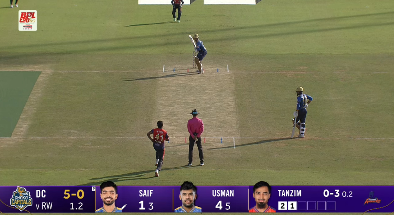 সিলেট আন্তর্জাতিক ক্রিকেট স্টেডিয়ামে শুরুতে টস জিতে রাজশাহীকে ব্যাট করার আমন্ত্রণ জানান ঢাকা ক্যাপিটালসের অধিনায়ক মোহাম্মদ মিঠুন। ব্যাটিংয়ে নেমে শুরুটা ভালো হয়নি রাজশাহী ওয়ারিয়র্সের। ইনিংসের প্রথম বলেই গোল্ডেন ডাক খেয়ে সাজঘরের পথ ধরেন ওপেনার সাহিবজাদা ফারহান। পরের উইকেটে নামা দলের অধিনায়ক নাজমুল হোসেন শান্তকে নিয়ে শুরুর চাপ সামলেই নিয়েছিলেন আরেক ওপেনার তানজিদ হাসান তামিম। কিন্তু জুটিটা বড় করা হয়নি। ২০ রান করে থামেন তানজিদ। আর আগের ম্যাচের সেঞ্চুরিয়ান শান্তর ব্যাট থেকে এসেছে ৩৭ রান। এছাড়া মোহাম্মদ নেওয়াজ ২৬ ও মুশফিকুর রহিম ২৪ রান করেন।