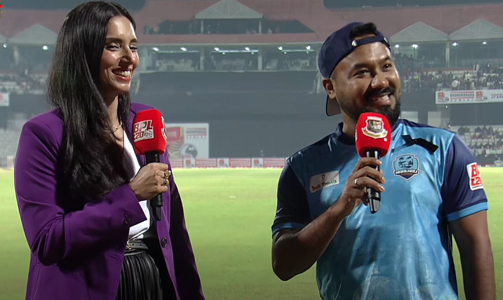 বিনোদন ডেস্ক : বিপিএল’র মাঠে দাঁড়িয়ে পাকিস্তানি সঞ্চালক জয়নব আব্বাস ও ‘ব্যাচেলর পয়েন্ট’খ্যাত অভিনেতা জিয়াউল হক পলাশ। সঞ্চালক জয়নব আব্বাস বলেন, “আমার সঙ্গে এমন একজন উপস্থিত রয়েছেন, যাকে পরিচয় করিয়ে দেওয়ার কিছু নেই। বিনোদন জগতে তার ব্যাপক পরিচিতি যেমন রয়েছে, তেমনই নোয়াখালী এক্সপ্রেসের ব্র্যান্ড অ্যাম্বাসেডর, তার নাম-জিয়াউল হক পলাশ।”