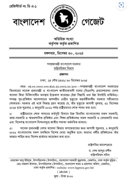 এতে বলা হয়, গণপ্রজাতন্ত্রী বাংলাদেশ সরকারের তিনবারের সাবেক প্রধানমন্ত্রী ও বাংলাদেশ জাতীয়তাবাদী দলের (বিএনপি) চেয়ারপার্সন বেগম খালেদা জিয়া চিকিৎসাধীন অবস্থায় ইন্তেকাল করেছেন (ইন্না লিল্লাহি ওয়া ইন্না ইলাইহি রাজিউন)। গণতন্ত্র পুনঃপ্রতিষ্ঠার আন্দোলনের আপসহীন নেত্রীর মৃত্যুতে অন্তর্বর্তীকালীন সরকার গভীরভাবে শোকাহত। সরকার এই মর্মে সিদ্ধান্ত গ্রহণ করেছে যে, তার মৃত্যুতে আগামী বুধবার, ৩১ ডিসেম্বর ২০২৫ হতে শুক্রবার, ২ জানুয়ারি ২০২৬ পর্যন্ত রাষ্ট্রীয়ভাবে শোক পালন করা হবে।