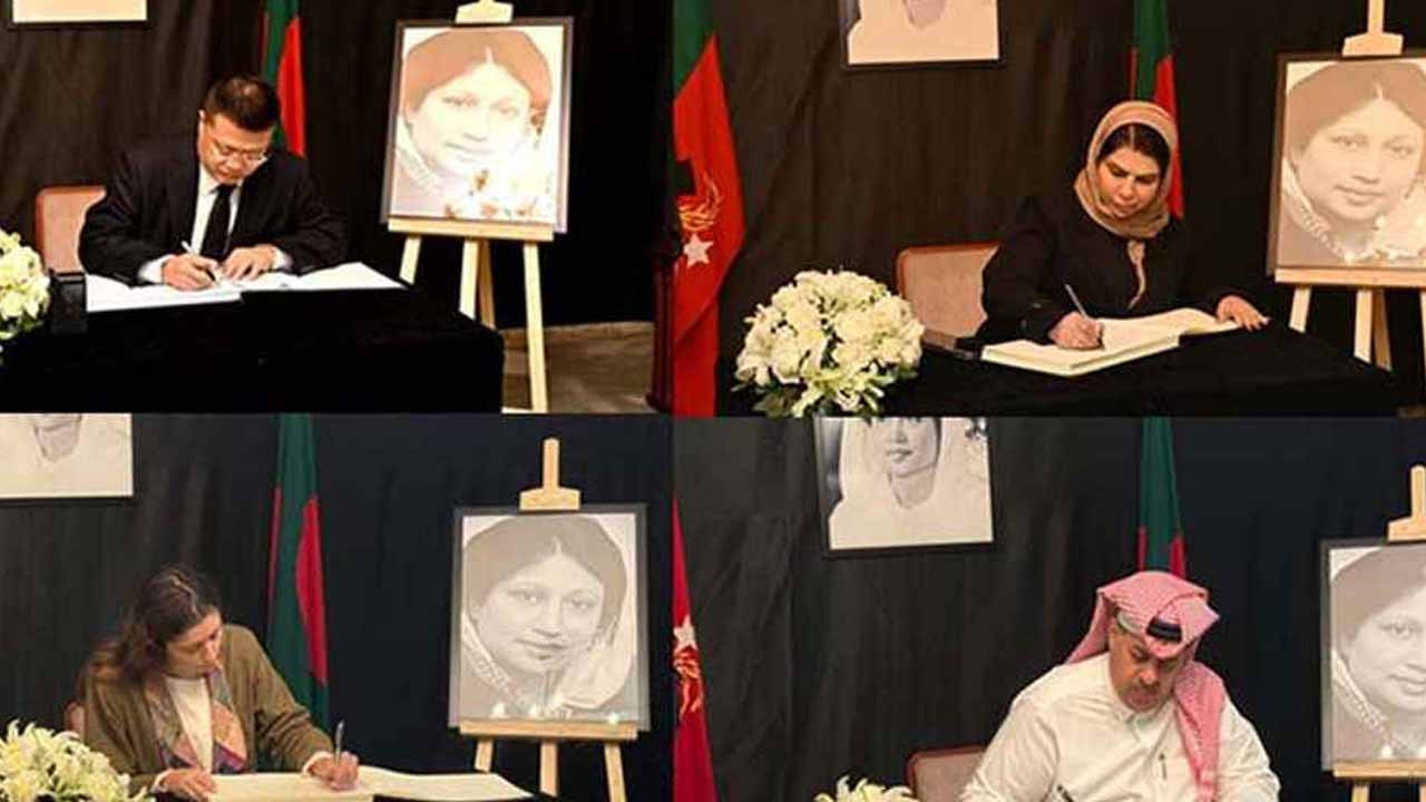শোক বইয়ে স্বাক্ষর করা দেশগুলোর মধ্যে চীন, ভারত, পাকিস্তান জার্মান, ইরান, ওমান, আলজেরিয়া, কাতার, ফ্রান্স, নরওয়ে, সুইডেন, ব্রুনাই, প্যালেষ্টাইন, স্পেনসহ, মরক্কো, ভুটান, ব্রাজিলসহ ২৮ টি দেশের প্রতিনিধিরা রয়েছেন।