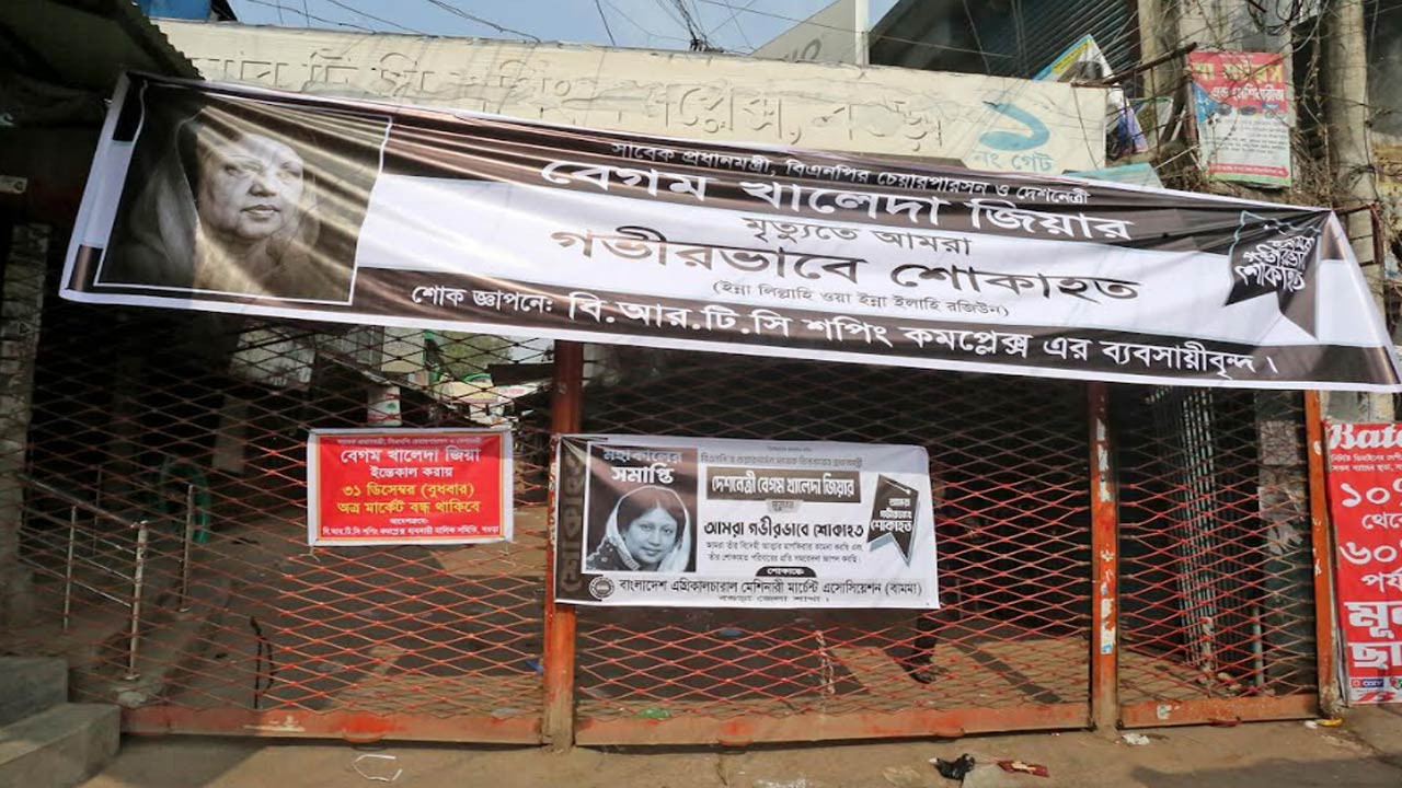 স্টাফ রিপোর্টার : তিনবারের সফল প্রধানমন্ত্রী ও বিএনপি চেয়ারপার্সন বেগম খালেদা জিয়ার মৃত্যুতে আজ বুধবার (৩১ ডিসেম্বর) শোকাচ্ছন্ন ছিল বগুড়া। বগুড়ার সন্তান শহীদ রাষ্ট্রপতি জিয়াউর রহমানের স্ত্রী, বগুড়ার পুত্রবধূ, সবার প্রিয় এই নেত্রীর প্রতি শ্রদ্ধা জানাতে ও রাষ্ট্রীয় শোকের প্রতি সংহতি প্রকাশ করে সকাল থেকেই জেলা শহরের ছোট-বড় সব ধরনের দোকানপাট, ব্যবসা প্রতিষ্ঠান ও বিপণীবিতান থেকে শুরু করে যাবতীয় ব্যবসায়িক কার্যক্রম বন্ধ রাখেন বগুড়ার আপামর ব্যবসায়ী।