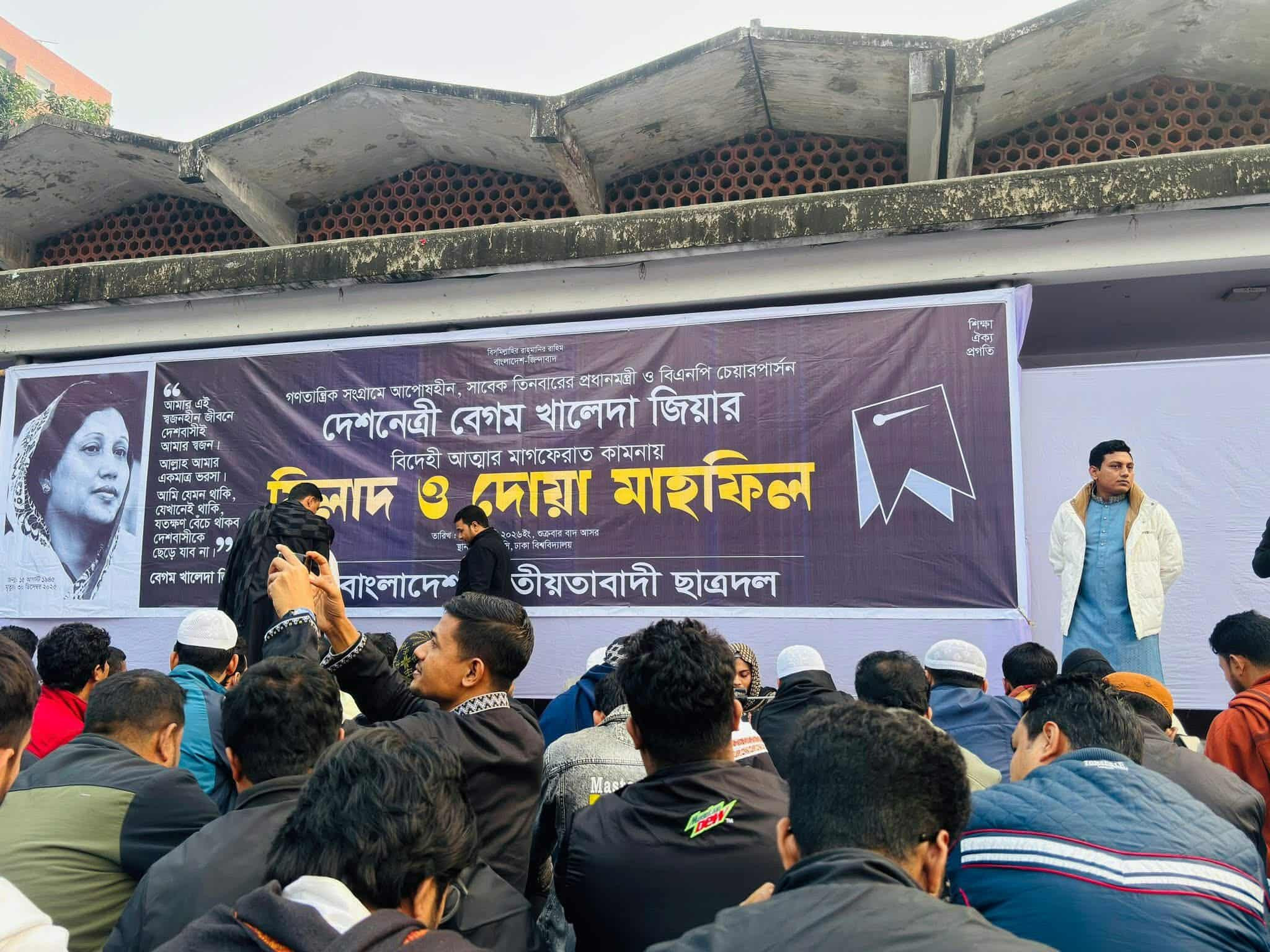 শুক্রবার (২ জানুয়ারি) ঢাকা বিশ্ববিদ্যালয়ের টিএসসি প্রাঙ্গণে এই দোয়া ও মিলাদ মাহফিল অনুষ্ঠিত হয়। এতে শাখা ছাত্রদলের বিভিন্ন পর্যায়ের নেতাকর্মীরা অংশগ্রহণ করেন। অনুষ্ঠানের শুরুতে পবিত্র কোরআন তেলাওয়াত করা হয়। এরপর বেগম খালেদা জিয়ার বিদেহী আত্মার মাগফিরাত কামনা করে বিশেষ দোয়া ও মিলাদ মাহফিল অনুষ্ঠিত হয়।