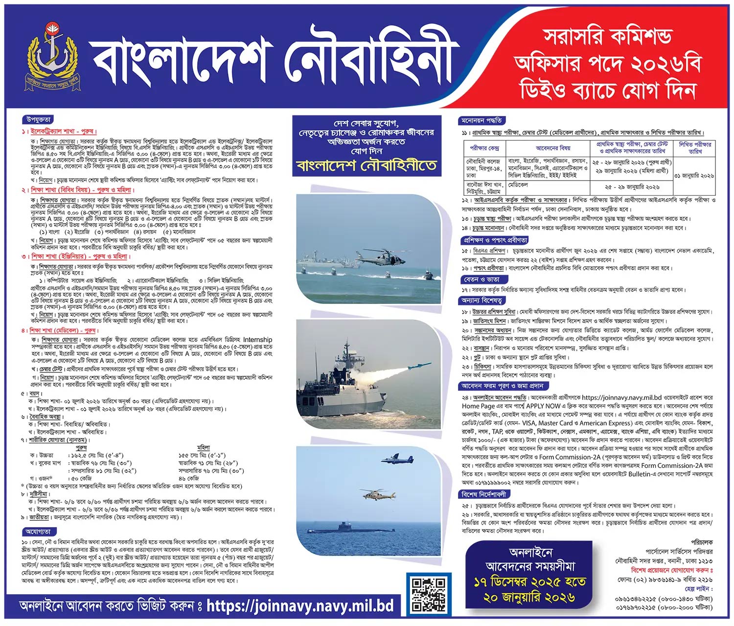 সম্প্রতি নিয়োগ বিজ্ঞপ্তি প্রকাশ করেছে বাংলাদেশ নৌবাহিনী। প্রতিষ্ঠানটির ২০২৬বি ডিইও ব্যাচে ‘কমিশন্ড অফিসার’ পদে জনবল নিয়োগ দেওয়া হবে। আগ্রহীরা আগামী ২০ জানুয়ারি পর্যন্ত অনলাইনের মাধ্যমে আবেদন করতে পারবেন। প্রার্থীরা ৩০ বছর বয়সেও আবেদনের সুযোগ পাবেন।