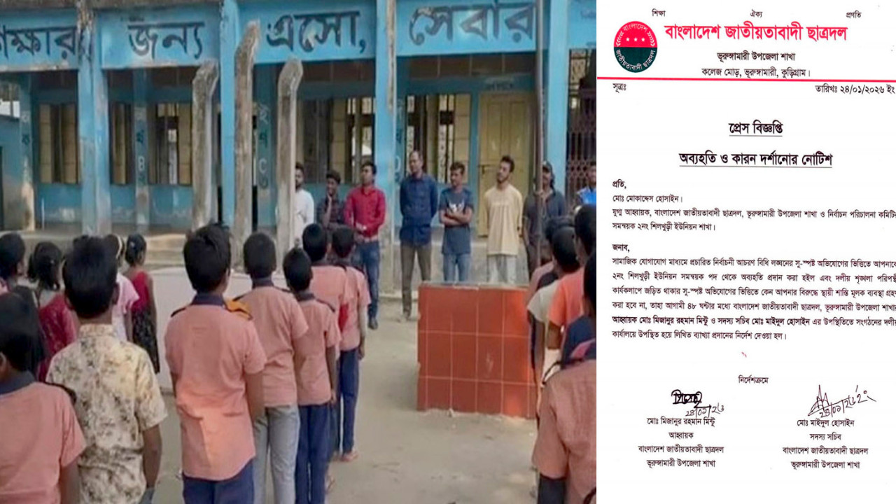 বৃহস্পতিবার (২২ জানুয়ারি) বিকেল সাড়ে ৩টার দিকে উপজেলার শিলখুড়ী ইউনিয়নের পূর্ব ধলডাঙ্গা সরকারি প্রাথমিক বিদ্যালয়ে এ ঘটনা ঘটে। ভিডিওতে দেখা যায়, উপজেলা ছাত্রদলের যুগ্ম আহ্বায়ক ও শিলখুড়ী ইউনিয়ন নির্বাচন পরিচালনা কমিটির সমন্বয়ক মোকাদ্দেস হোসাইনসহ ছাত্রদলের কয়েকজন নেতাকর্মীকে নিয়ে বিদ্যালয় প্রাঙ্গণে উপস্থিত হয়ে শিশুদের লাইনে দাঁড় করিয়ে ধানের শীষ প্রতীকের পক্ষে শ্লোাগান দিচ্ছেন। এ ঘটনা সামাজিক যোগাযোগ মাধ্যমে ছড়িয়ে পড়লে অভিভাবক ও সচেতন মহলে ব্যাপক প্রতিক্রিয়া দেখা দেয়। এর প্রেক্ষিতে শনিবার উপজেলা ছাত্রদলের সভাপতি মিজানুর রহমান মিন্টু ও সদস্য সচিব মাইদুল হোসাইন সইকৃত একপত্রে নির্বাচনি আচরণবিধি লঙ্ঘনের অভিযোগে তাকে নির্বাচন পরিচালনা কমিটির সমন্ব^য়ক পদ থেকে অব্যাহতি প্রদান এবং কেন তার বিরুদ্ধে স্থায়ী শাস্তিমূলক ব্যবস্থা গ্রহণ করা হবে না এ মর্মে ৪৮ ঘন্টার মধ্যে সশরীরে উপস্থিত হয়ে কারণ দর্শাতে নির্দেশ প্রদান করে।