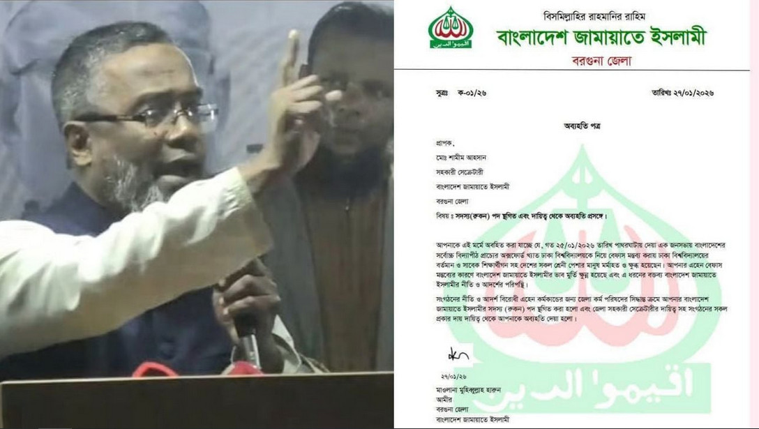 আরও পড়ুনবিষয়টি নিশ্চিত করে জামায়াতে ইসলামীর বরগুনা জেলার আমির মাওলানা মহিবুল্লাহ হারুন সংবাদমাধ্যমকে বলেন, শামীম আহসান যে ভাষায় বক্তব্য দিয়েছেন, তা জামায়াতে ইসলামীর নীতি ও আদর্শের সঙ্গে সামঞ্জস্যপূর্ণ নয়।
