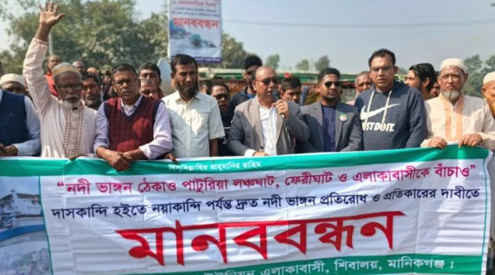 মানিকগঞ্জে পদ্মা ও যমুনা নদীর ভাঙন থেকে পাটুরিয়া এলাকাকে রক্ষার দাবিতে বিক্ষোভ মিছিল ও মানববন্ধন কর্মসূচি পালন করেছে এলাকাবাসী।