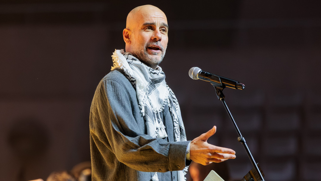 বক্তব্যের সময় পরিধান করেন কেফিয়াহ, যা কিনা ফিলিস্তিনের ঐতিহ্যবাহী স্কার্ফ। শিশুদের পক্ষ নিয়ে সেখানে আবেগঘন বক্তব্য দেন তিনি। অনুষ্ঠানে ম্যানচেস্টার সিটির কোচ বলেন, শুভ সন্ধ্যা, আসসালামু আলাইকুম, চমৎকার। গত দুই বছরে যখনই আমি সামাজিক যোগাযোগমাধ্যম বা টেলিভিশনে কোনো শিশুকে দেখি, সেখানে ধ্বংসস্তূপের মাঝে দাঁড়িয়ে তারা আর্তনাদ করছে, আমার মা কোথায়? অথচ সে এখনো জানে না কী ঘটেছে। তিনি আরও বলেন, আমি সব সময় ভাবি -তারা আসলে কী চিন্তা করছে? আমার মনে হয় আমরা তাদের একা ফেলে এসেছি, পরিত্যাগ করেছি। আমি সব সময় কল্পনা করি তারা বলছে তোমরা কোথায়? এসো আমাদের সাহায্য করো। গার্দিওলা অবাক হন বিশ্বের ক্ষমতাধর দেশ ও ব্যক্তিদের নীরবতা নিয়েও, সম্ভবত যারা ক্ষমতায় আছেন তারা কাপুরুষ, কারণ মূলত তারাই নিষ্পাপ তরুণদের পাঠাচ্ছেন অন্য নিষ্পাপ মানুষকে হত্যা করতে। অনুষ্ঠানে বক্তব্য দেওয়ার সময় ফিলিস্তিন ও মানবতার জন্য বিবৃতি দিয়ে একটি সাহসী পদক্ষেপ নেওয়ার আহ্বান জানান তিনি।