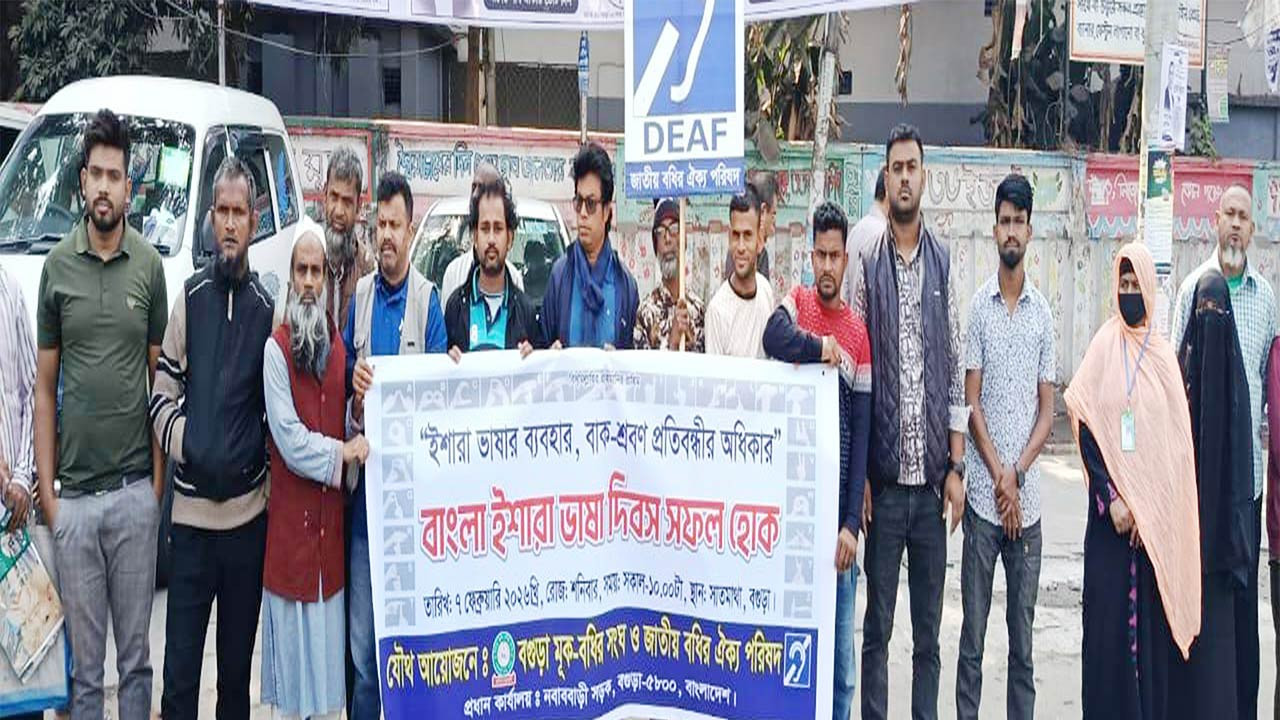 ‘ইশারা ভাষার ব্যবহার, বাক-শ্রবণ প্রতিবন্ধী ব্যক্তির অধিকার’-এই প্রতিপাদ্য নিয়ে আজ শনিবার (৭ ফেব্রুয়ারি) বগুড়াসহ উত্তরাঞ্চলের বিভিন্ন জায়গায় বাংলা ইশারা ভাষা দিবস পালিত হয়েছে। বগুড়া মূক-বধির সংঘ: দিবসটি পালন উপলক্ষ্যে আজ শনিবার (৭ ফেব্রুয়ারি) সকাল ১০টায় বগুড়া মূক-বধির সংঘের উদ্যোগে একটি র্যালি শহরের প্রধান কার্যালয় সড়ক প্রশিক্ষণ করে সাতমাথায় এক মানববন্ধন কর্মসূচি পালন করা হয়।