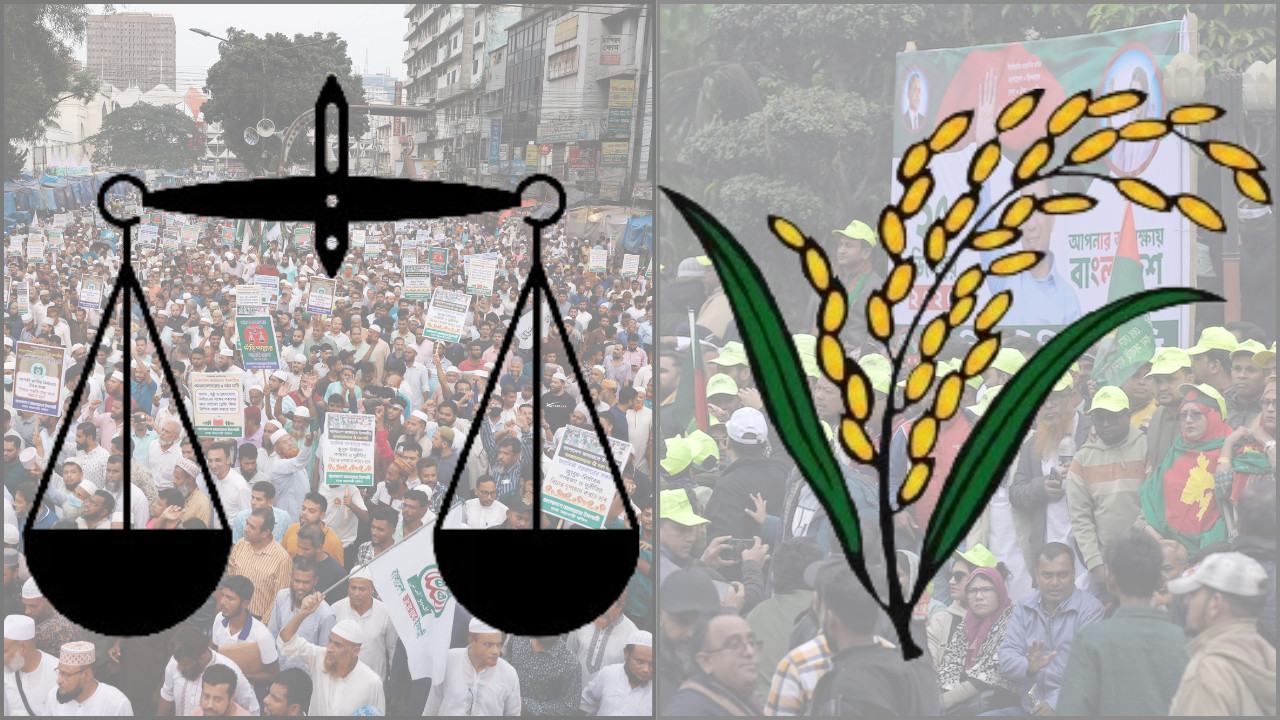 দেশব্যাপী রাস্তার পাশে এবং খুঁটিতে বিএনপি’র ধানের শীষ ও জামায়াতের দাঁড়িপাল্লার পোস্টার দেখা যাচ্ছে। পার্টির অফিসগুলোতে নির্বাচনি গান বাজছে। এটি আগের নির্বাচনের সঙ্গে বৈপরীত্যপূর্ণ, যখন আওয়ামী লীগের নৌকা প্রতীক সর্বত্র দেখা যেত। বিশেষজ্ঞরা বলছেন, ধর্মীয় কারণে নয়, জামায়াতের পরিচ্ছন্ন ও ধারাবাহিক রাজনৈতিক চিত্র ভোটারদের কাছে গ্রহণযোগ্যতা হিসাবে কাজ করছে। সমীক্ষা অনুযায়ী, ভোটাররা দুর্নীতি ও অর্থনৈতিক অবস্থাকে সর্বাধিক গুরুত্ব দিচ্ছেন, ধর্মীয় বা প্রতীকী বিষয়ের গুরুত্ব তুলনামূলকভাবে কম। তরুণ ভোটাররা আশা করছেন, আগামী সরকার তাদের ভোট ও মত প্রকাশের স্বাধীনতা নিশ্চিত করবে। প্রথমবার ভোট দিচ্ছেন ২১ বছর বয়সী মোহাম্মদ রাকিব বলেন, আগের সময়ে ভোট দেওয়া বা মত প্রকাশ করা কঠিন ছিল। আশা করি নতুন সরকার এই স্বাধীনতা বজায় রাখবে।