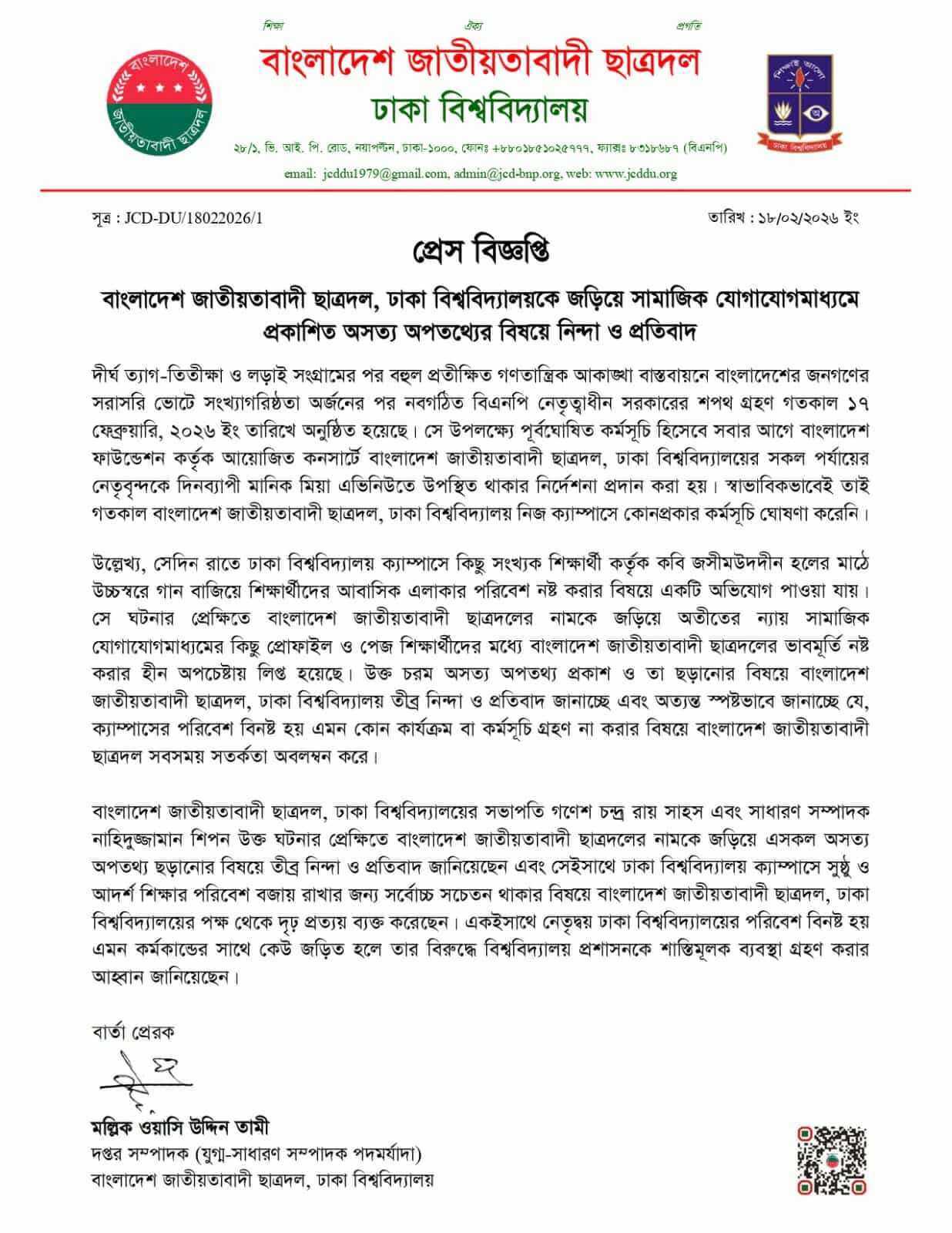 ঢাবি ছাত্রদলের সভাপতি গণেশ চন্দ্র রায় সাহস ও সাধারণ সম্পাদক নাহিদুজ্জামান শিপন যৌথভাবে বলেন, “ক্যাম্পাসের পরিবেশ নষ্ট হয়—এমন কোনো কর্মকাণ্ডে ছাত্রদল কখনোই জড়িত নয়। ভবিষ্যতেও এ ধরনের অপপ্রচারের বিরুদ্ধে আমরা আইনি ও সাংগঠনিকভাবে ব্যবস্থা নেব।”