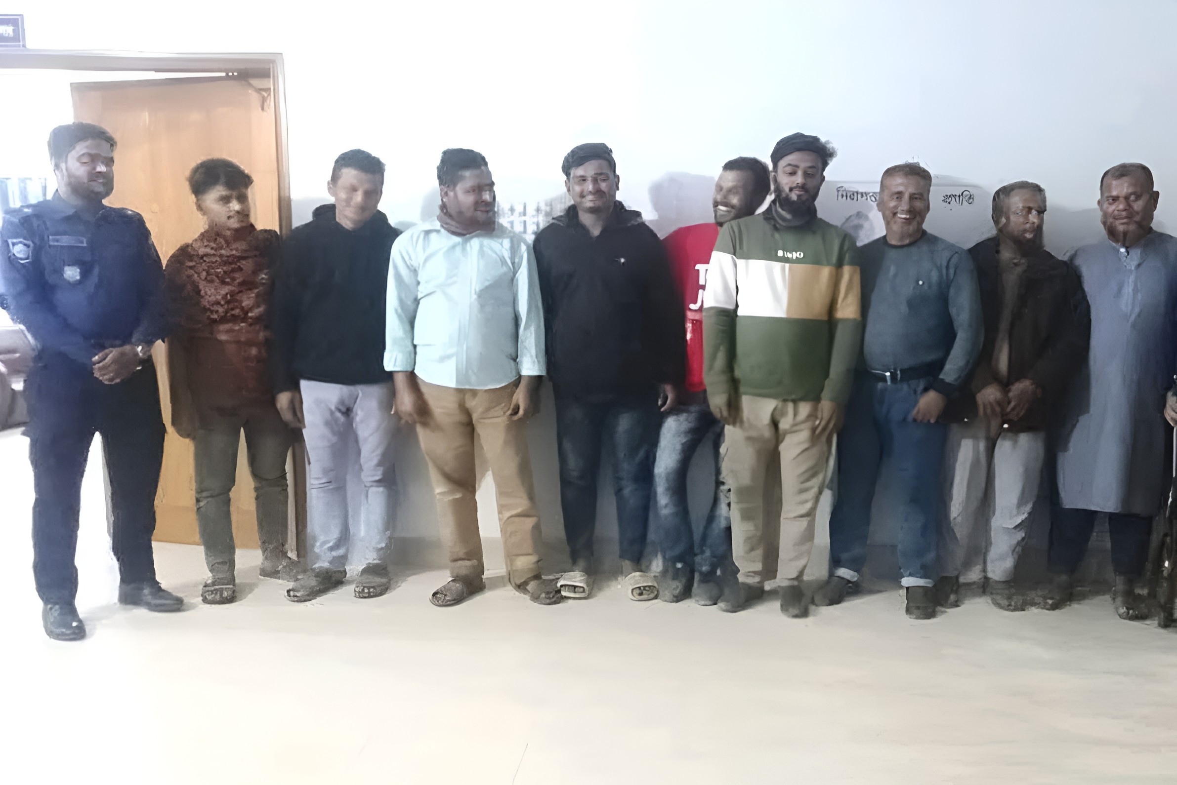 পুলিশ জানায়, নিমসার কাঁচাবাজারে দীর্ঘদিন ধরে পণ্যবাহী ট্রাক, লেগুনা, ছোট গাড়ি ও অটোরিকশা থেকে টোলের নামে চাঁদা আদায় করা হচ্ছিল। অভিযোগের ভিত্তিতে নজরদারি চালিয়ে বুধবার রাতে মহাসড়কে চাঁদা আদায়ের সময় অভিযান চালিয়ে ১১ জনকে হাতেনাতে আটক করা হয়।