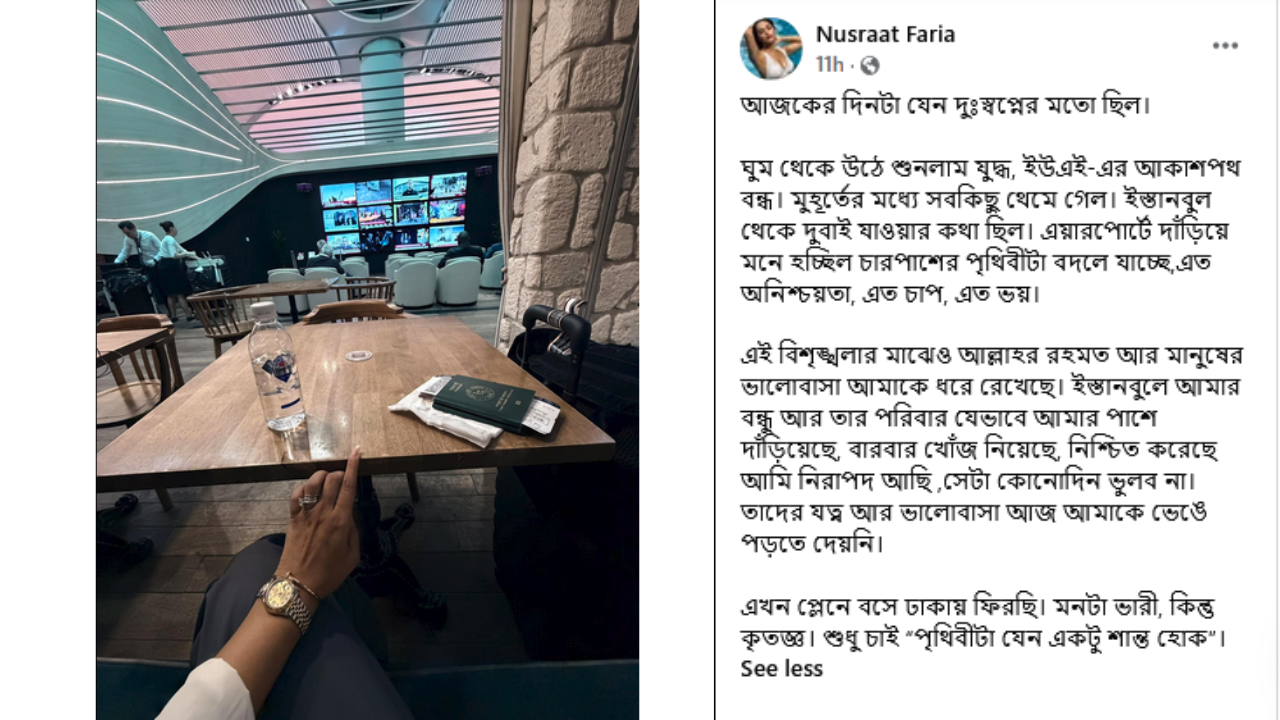 গত শনিবার রাতে দেওয়া সেই পোস্টে নুসরাত ফারিয়া দিনটিকে ‘দুঃস্বপ্নের মতো’ বলে বর্ণনা করেন। তিনি লেখেন, ঘুম থেকে উঠে শুনলাম যুদ্ধ, ইউএই(আরব আমিরাতের)-এর আকাশপথ বন্ধ। মুহূর্তের মধ্যে সবকিছু থেমে গেল। ইস্তানবুল থেকে দুবাই যাওয়ার কথা ছিল। এয়ারপোর্টে দাঁড়িয়ে মনে হচ্ছিল চারপাশের পৃথিবীটা বদলে যাচ্ছে, এত অনিশ্চয়তা, এত চাপ, এত ভয়।তবে এই সংকটের মুহূর্তে ইস্তাম্বুলে অবস্থানরত বন্ধু ও তাদের পরিবারের প্রতি কৃতজ্ঞতা প্রকাশ করেছেন ফারিয়া। চরম বিশৃঙ্খলার মাঝেও তারা যেভাবে ফারিয়ার নিরাপত্তা নিশ্চিত করেছেন এবং বারবার খোঁজ নিয়েছেন, তা তাকে ভেঙে পড়তে দেয়নি বলে জানান অভিনেত্রী।