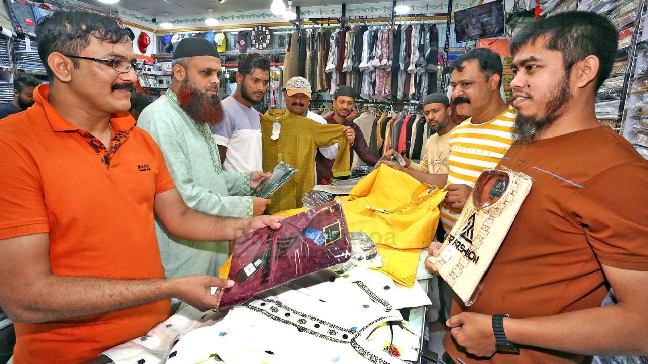 বগুড়ার ঈদ মার্কেট : ঘুরে ঘুরে পছন্দের পাঞ্জাবি কিনছেন ক্রেতারা, ছবি: দৈনিক করতোয়া