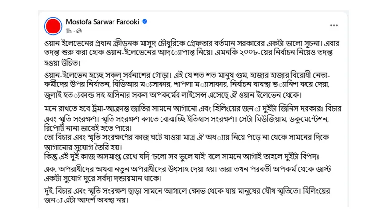 করতোয়া বিনোদন: অন্তর্বর্তী সরকারের সাবেক উপদেষ্টা মোস্তফা সরয়ার ফারুকী বলেছেন, ওয়ান-ইলেভেনের প্রধান কুশীলব মাসুদ চৌধুরীকে গ্রেপ্তার বর্তমান সরকারের একটা ভালো সূচনা। এবার তদন্ত শুরু হোক ওয়ান-ইলেভেনের আদ্যোপান্ত নিয়ে। মঙ্গলবার (২৪ মার্চ) তার ভেরিফায়েড ফেসবুক পোস্টে তিনি এ মন্তব্য করেন।ফেসবুক পোস্টে মোস্তফা সরয়ার ফারুকী লেখেন, ওয়ান-ইলেভেনের প্রধান ক্রীড়নক মাসুদ চৌধুরীকে গ্রেপ্তার বর্তমান সরকারের একটা ভালো সূচনা মাত্র। এবার তদন্ত শুরু করা হোক ওয়ান-ইলেভেনের আদ্েযাপান্ত নিয়ে। এমনকি ২০০৮-এর নির্বাচন নিয়েও তদন্ত হওয়া উচিত। ওয়ান-ইলেভেন হচ্ছে সব সর্বনাশের গোড়া। এই যে শত শত মানুষ গুম, হাজার হাজার বিরোধী নেতাকর্মীর ওপর নির্যাতন, বিডিআর ম্যাসাকার, শাপলা ম্যাসাকার, নির্বাচন-ব্যবস্থা ভ্যানিশ করে দেওয়া, জুলাই হত্যকাণ্ডসহ হাসিনার সব অপকর্মের লাইসেন্স এসেছে ওই ওয়ান-ইলেভেন থেকে।তিনি আরো লেখেন, মনে রাখতে হবে, ট্রমা-আক্রান্ত জাতির সামনে আগানো এবং হিলিংয়ের জন্য দুইটা জিনিস দরকার—বিচার ও স্মৃতি সংরক্ষণ। স্মৃতি সংরক্ষণ বলতে বোঝাচ্ছি ইতিহাস সংরক্ষণ। সেটা মিউজিয়াম, ডকুমেন্টেশন, রিপোর্টসহ নানাভাবেই হতে পারে। বিচার ও স্মৃতি সংরক্ষণের কাজ ঘটে যাওয়া মাত্র ওই অধ্যায় নিয়ে পড়ে না থেকে সামনের দিকে আগানোর সুযোগ তৈরি হয়।