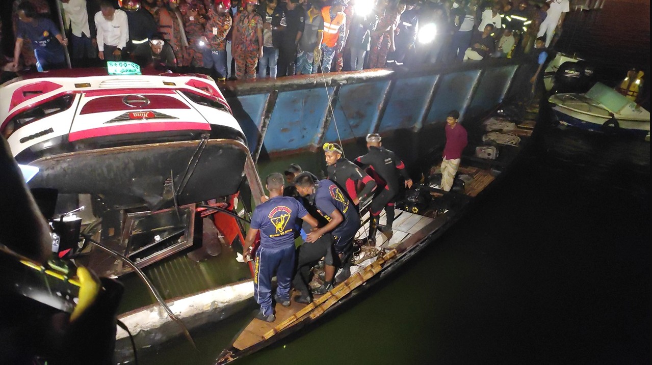 বুধবার (২৫ মার্চ) রাত সাড়ে ১১টার দিকে নদীর পানির নিচে থাকা বাসটির সামনের অংশ উদ্ধার করা হলে একের পর এক মরদেহ বের করতে দেখা যায় ফায়ার সার্ভিসের ডুবুরি দলকে।