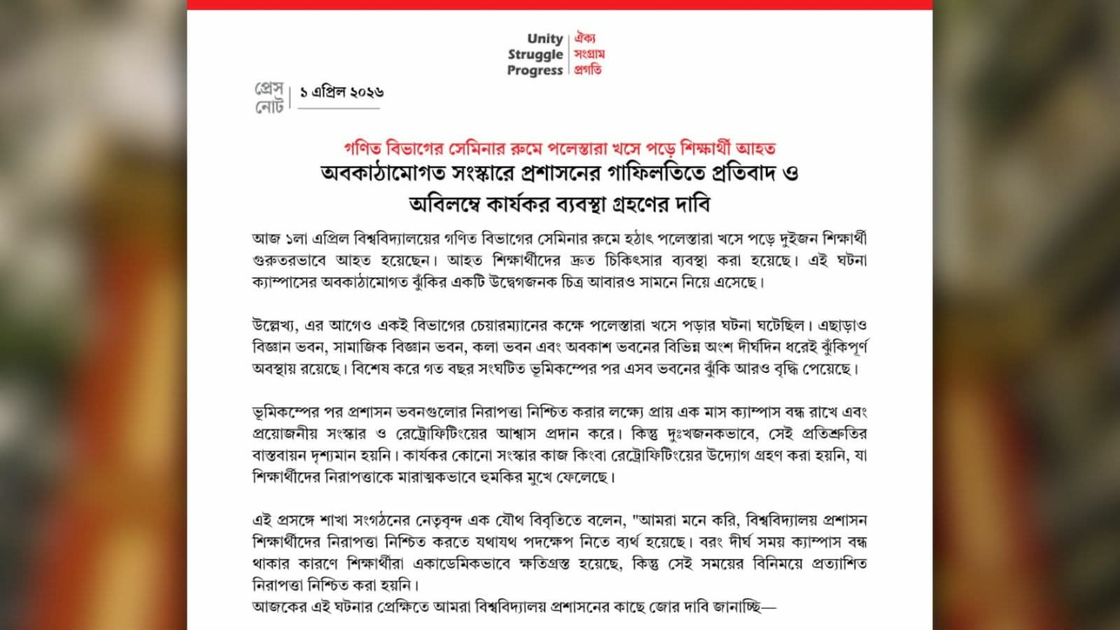 এছাড়া বিজ্ঞান ভবন, সামাজিক বিজ্ঞান ভবন, কলা ভবনসহ বিশ্ববিদ্যালয়ের বিভিন্ন স্থাপনার একাধিক অংশ দীর্ঘদিন ধরে ঝুঁকিপূর্ণ অবস্থায় রয়েছে। বিশেষ করে গত বছরের ভূমিকম্পের পর এসব ঝুঁকি আরও বেড়েছে বলে অভিযোগ করা হয়। সংগঠনটির দাবি, ভূমিকম্পের পর নিরাপত্তা নিশ্চিত করতে প্রশাসন কিছু পদক্ষেপ নেওয়ার আশ্বাস দিলেও বাস্তবে কার্যকর কোনো সংস্কার বা রেট্রোফিটিং কাজ দৃশ্যমান হয়নি। এতে শিক্ষার্থীদের নিরাপত্তা হুমকির মুখে পড়েছে।