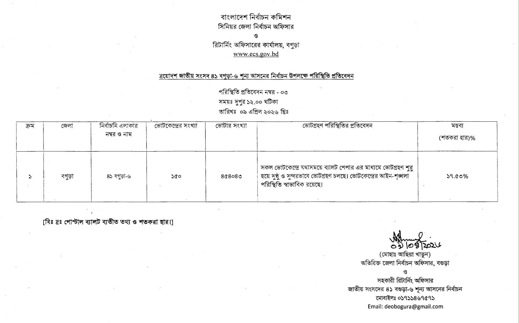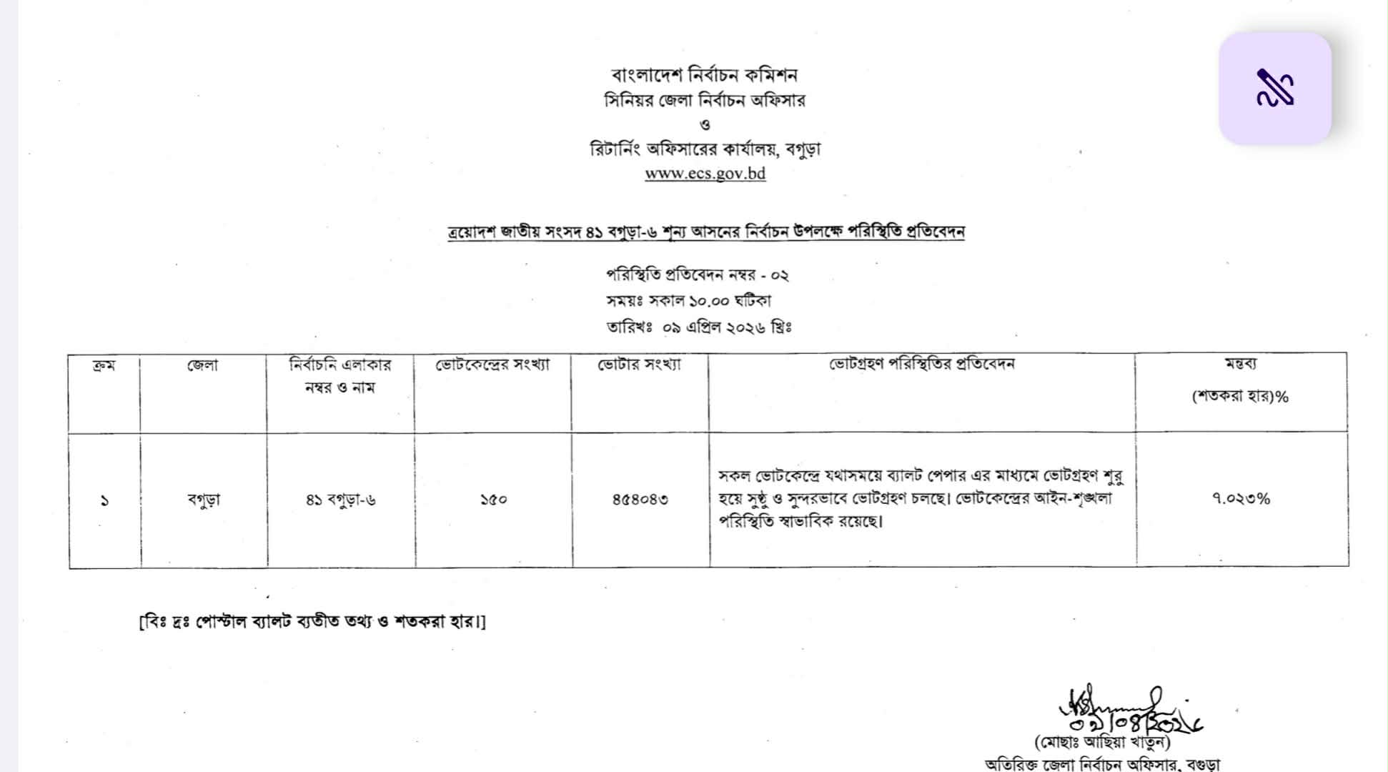 জেলা রিটার্নিং কর্মকর্তা আছিয়া খাতুনের স্বাক্ষরিত পরিস্থিতি পর্যবেক্ষণ প্রতিবেদন ২ অনুযায়ী শতকরা ৭.০২৩ শতাংশ ভোট পড়েছে বেলা ১০টা পর্যন্ত। গণমাধ্যমে পাঠানো এই পর্যবেক্ষণ প্রতিবেদনটি পোস্টাল ব্যালট ব্যতীত বলে উল্লেখ করা হয়েছে।
