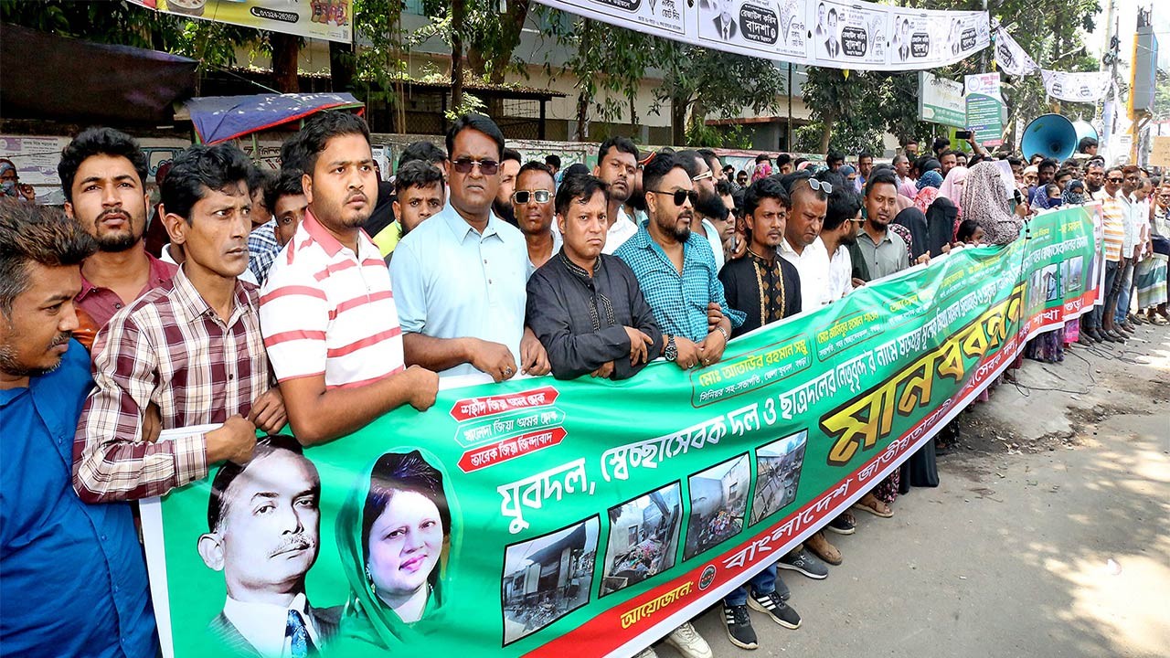 বগুড়ায় বিএনপি’র অঙ্গ ও সহযোগী দলের নেতাকর্মীদের বিরুদ্ধে মামলা প্রত্যাহারের দাবিতে মানববন্ধন