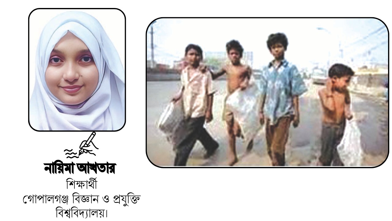 শহরের ব্যস্ত সড়কের পাশে ফুল হাতে যে ফুলেরা দাঁড়িয়ে থাকে, ফুটপাথের ধুলোয় প্রকৃতির সাথে যে নিষ্পাপ মুখগুলো খেলা করে, কিংবা রেলস্টেশনের কোণে কোণে যে ছোট ছোট মুখগুলো প্রতিদিন বেঁচে থাকার সংগ্রামে নেমে পড়ে তাদের আমরা পথশিশু বলি। এই পথশিশুরা শুধু পথের নয়, তারা রাষ্ট্রেরও সন্তান, যাদের প্রতি আমাদের সম্মিলিত দায়িত্ব রয়েছে, যা আমরা অনেকাংশেই এড়িয়ে যাই। এই ফুলগুলো পরিস্থিতির নির্মম শিকার। পরিবার হারানো, দারিদ্র্যের চরম রূপ, পারিবারিক সহিংসতা, দুর্ঘটনা কিংবা প্রাকৃতিক দুর্যোগ তাদের ঠেলে দেয় রাস্তায়। সেখানে তাদের জীবন মানে অনিশ্চয়তা, ক্ষুধা, ভয় এবং বেঁচে থাকার এক অবিরাম লড়াই। একটি শিশুর যে বয়সে স্কুলের বেঞ্চে বসে রঙিন স্বপ্ন বোনার কথা, সেই বয়সেই তারা শিখে যায় কীভাবে প্রতিদিনের খাবার জোগাড় করতে হয়। এই কঠিন বাস্তবতায় পথশিশুরা জড়িয়ে পড়ে বিভিন্ন ধরনের শিশুশ্রমে। কেউ হকারি করে, কেউ ফুল বিক্রি করে, কেউ গাড়ির কাঁচ মুছে, কেউ খাবার হোটেলে কাজ করে , কেউ আবার ভিক্ষাবৃত্তিতে বাধ্য হয়, আবার কেউ কেউ ঝুঁকিপূর্ণ কাজেও নিযুক্ত হয় যেমন আবর্জনা সংগ্রহ, কারখানায় কাজ বা অপরাধমূলক চক্রের সঙ্গে যুক্ত হওয়া। এ যেন শৈশবের নিষ্পাপতা হারিয়ে বেঁচে থাকার নির্মম যুদ্ধের গল্প।