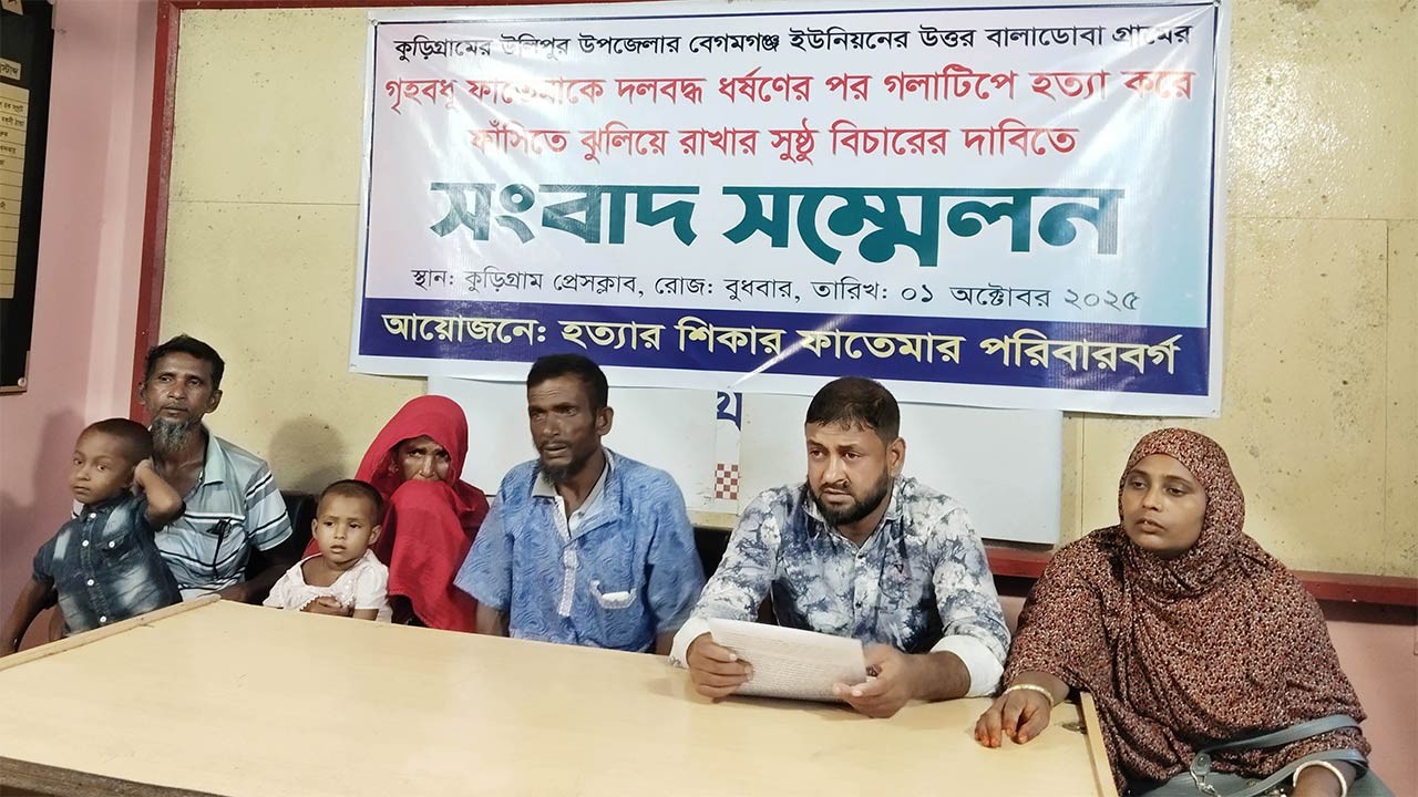 কুড়িগ্রাম জেলাা প্রতিনিধি: কুড়িগ্রামের উলিপুর উপজেলার বেগমগঞ্জে গৃহবধূ ফাতেমাকে দলবদ্ধ ধর্ষণের পর গলাটিপে হত্যা করে ফাঁসিতে ঝুলিয়ে রাখার অভিযোগ তুলে দৃষ্টান্তমূলক বিচারের দাবি করেছে নিহতের পরিবার। আজ বুধবার (২৪ সেপ্টেম্বর) সকালে কুড়িগ্রাম প্রেস ক্লাবে এক সংবাদ সম্মেলনে এই দাবি জানান নিহতের স্বজনরা। এসময় নিহতের বাবা-মা’সহ স্বজনরা উপস্থিত ছিলেন।