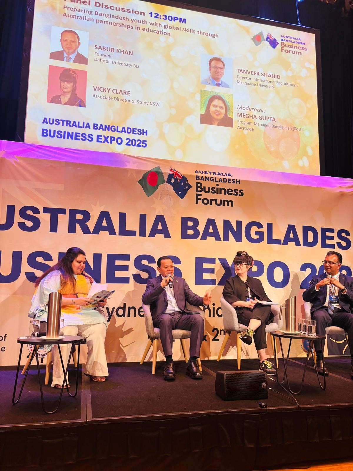 সিডনি, অস্ট্রেলিয়া-(০৩ অক্টোবর- ২০২৫) – ড্যাফোডিল ইন্টারন্যাশনাল ইউনিভার্সিটি (ডিআইইউ)-এর ট্রাস্টি বোর্ডের চেয়ারম্যান এবং বাংলাদেশ বেসরকারি বিশ্ববিদ্যালয় সমিতির (এপিইউবি) চেয়ারম্যান ড. মো. সবুর খান  ১-২ অক্টোবর  অনুষ্ঠিত অস্ট্রেলিয়া-বাংলাদেশ বিজনেস এক্সপো ২০২৫ (এবিবিএফ) এ বাংলাদেশের প্রতিনিধিত্ব করেন। সিডনী ইন্টারন্যাশনাল কনভেনশন এন্ড এক্সিবিশন সেন্টারে আয়োজিত অস্ট্রেলিয়া-বাংলাদেশ বিজনেস ফোরাম (এবিবিএফ) আয়োজিত এই এক্সপো দুই দেশের মধ্যে বাণিজ্য, শিক্ষা এবং উদ্ভাবনী অংশীদারিত্ব জোরদার করার জন্য ৩,০০০ এরও বেশি পেশাদার, শিল্প নেতা এবং শিক্ষাবিদ একত্রিত হয়েছিল। এই অনুষ্ঠানে বিশেষজ্ঞদের নেতৃত্বে সেমিনার, সেক্টর প্রদর্শনী এবং টেক্সটাইল, আইটি, শিক্ষা, কৃষি, খাদ্য, চামড়া এবং ওষুধ শিল্পের উপর দৃষ্টি নিবদ্ধ করে নেটওয়ার্কিং সুযোগগুলি অন্তর্ভুক্ত ছিল।