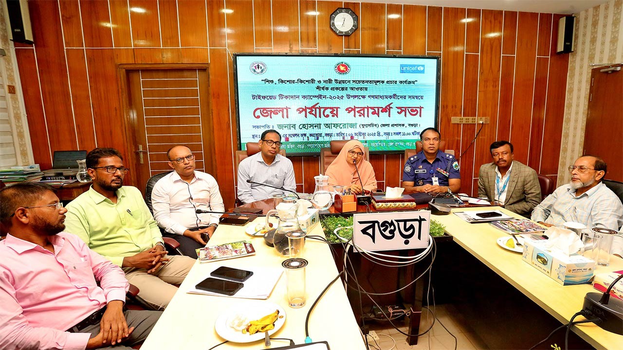 শিশু, কিশোর-কিশোরী ও নারী উন্নয়নে সচেতনতামূলক প্রচার কার্যক্রম শীর্ষক প্রকল্পের আওতায় বগুড়া জেলা তথ্য অফিসের আয়োজনে ও সম্প্রচার মন্ত্রণালয়ের সহযোগিতায় সারাদেশে পাঁচ কোটি শিশুকে টাইফয়েডের টিকার আওতায় নিয়ে আসা হবে। পরামর্শ সভায় স্বাগত বক্তব্য রাখেন সিনিয়র জেলা তথ্য অফিসার মাহফুজার রহমান।